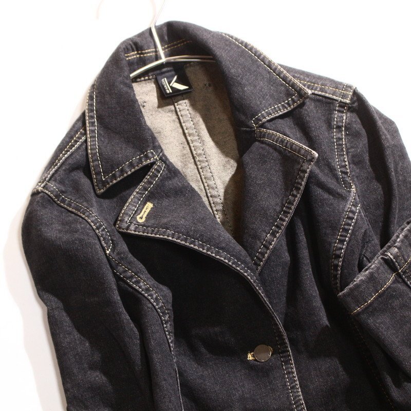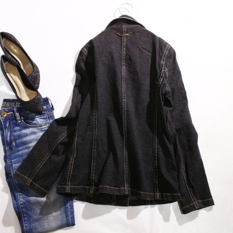 ストレッチデニム、ロゴボタン、女性らしい綺麗めデニムジャケットです。