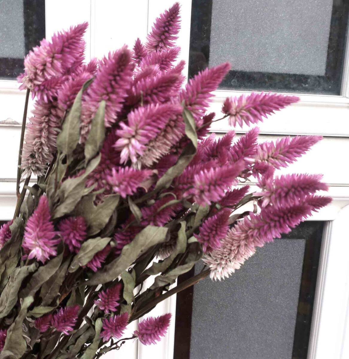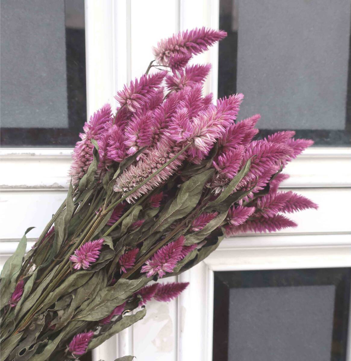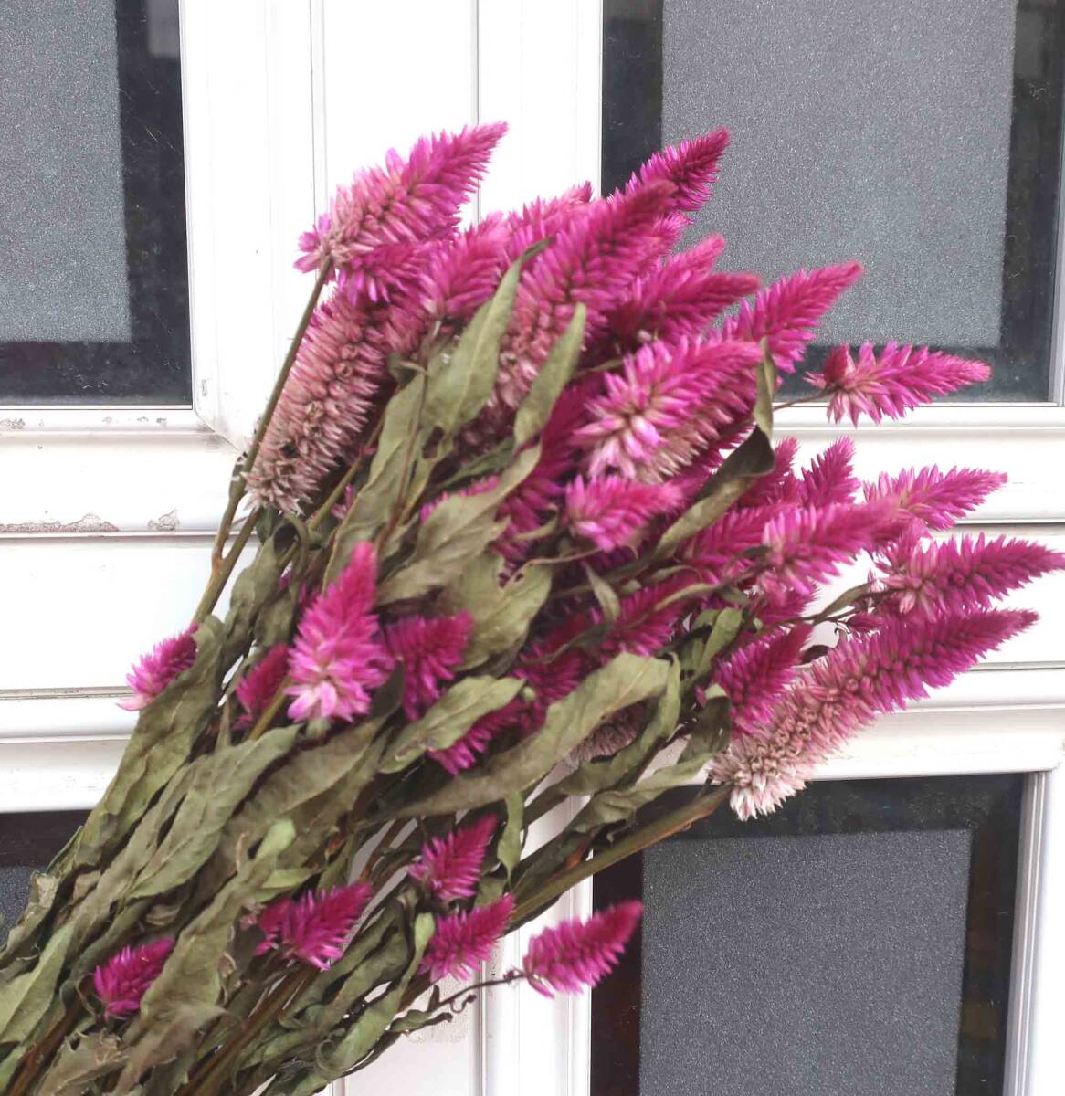 ピンク色のケイトウピンク色20本で1束です。長さは約50センチあります。リサイクルカートンにて普通郵便定形外にて送らせていただきます。