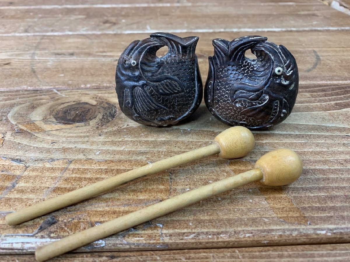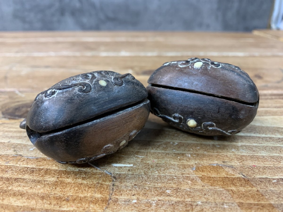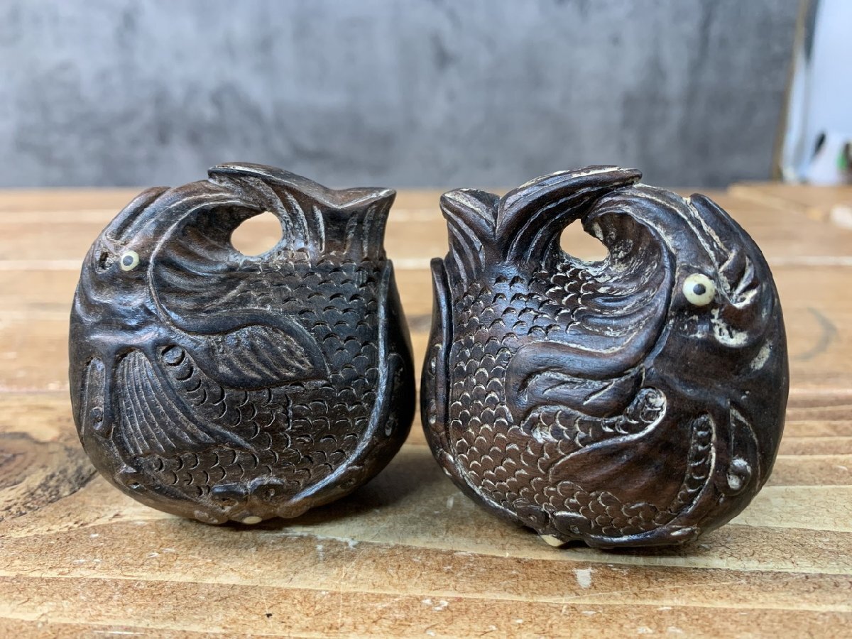【WS-1703】黒檀? 木彫 木魚 根付 携帯 ミニ 1点約42~44g 約5.5x5.5x3.5cm 2点セット まとめ 同梱可【千円市場】