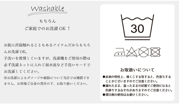 ・当商品は手洗いを推奨です。 洗濯機をご利用の際は、必ず【洗濯ネット】をご使用の上、手洗いモード等にてお洗濯を行って下さい。 | |