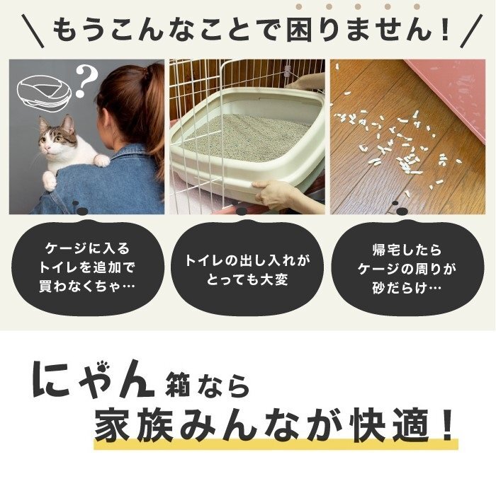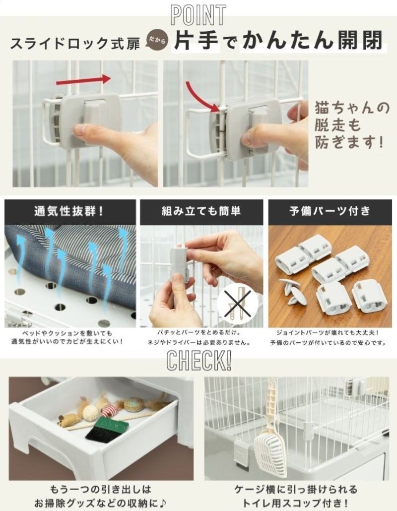 商品説明 | トレイ収納型 キャットケージ 砂が飛び散りにくい切り返しのついたモデル ケージを開けずにトイレの掃除ができる お世話しやすい中央の扉はスライドロックだから片手で簡単開閉 おもちゃや掃除グッズをしまえる収納引き出し付き ■カラー:アイボリー ■サイズ:800×800×560(mm) ■素材:PP、ABS、スチール ■付属品:組み立てパーツ、トイレ用スコップ |