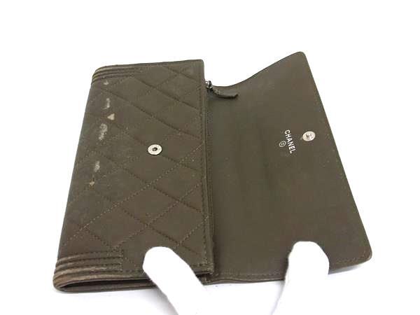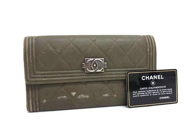 1円 CHANEL シャネル ココマーク ボーイシャネル マトラッセ レザー 二つ折り 長財布 ウォレット 札入れ 小銭入れ カーキ系 FV2758