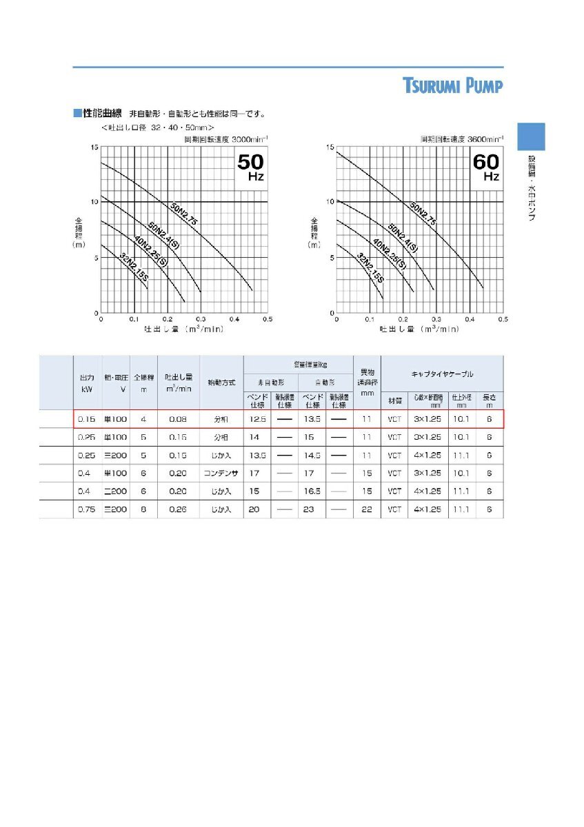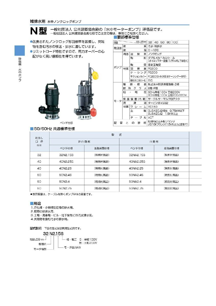 【代引不可】鶴見製作所 ツルミポンプ 雑排水用 水中ノンクロッグポンプ N型 自動形 口径32mm 50Hz 東日本用 単相100V 出力0.15kW