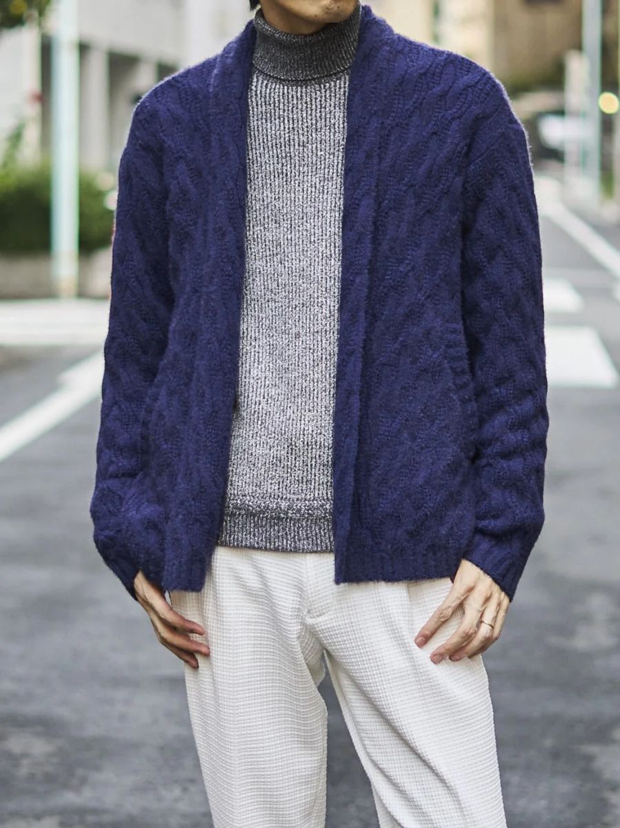 立体感のあるケーブル編みがあたたかみと表情を加え、やわらかく伸縮性のある素材が快適な着心地を実現。軽やかに羽織れるため、デイリーのカジュアルスタイルはもちろん、ジャケットやシャツとのレイヤードにも自然に馴染みます。都会的で洗練された大人のカジュアルスタイルを引き立てる万能カーディガンです。