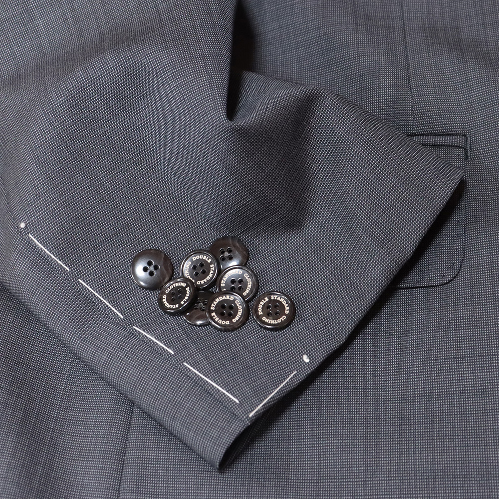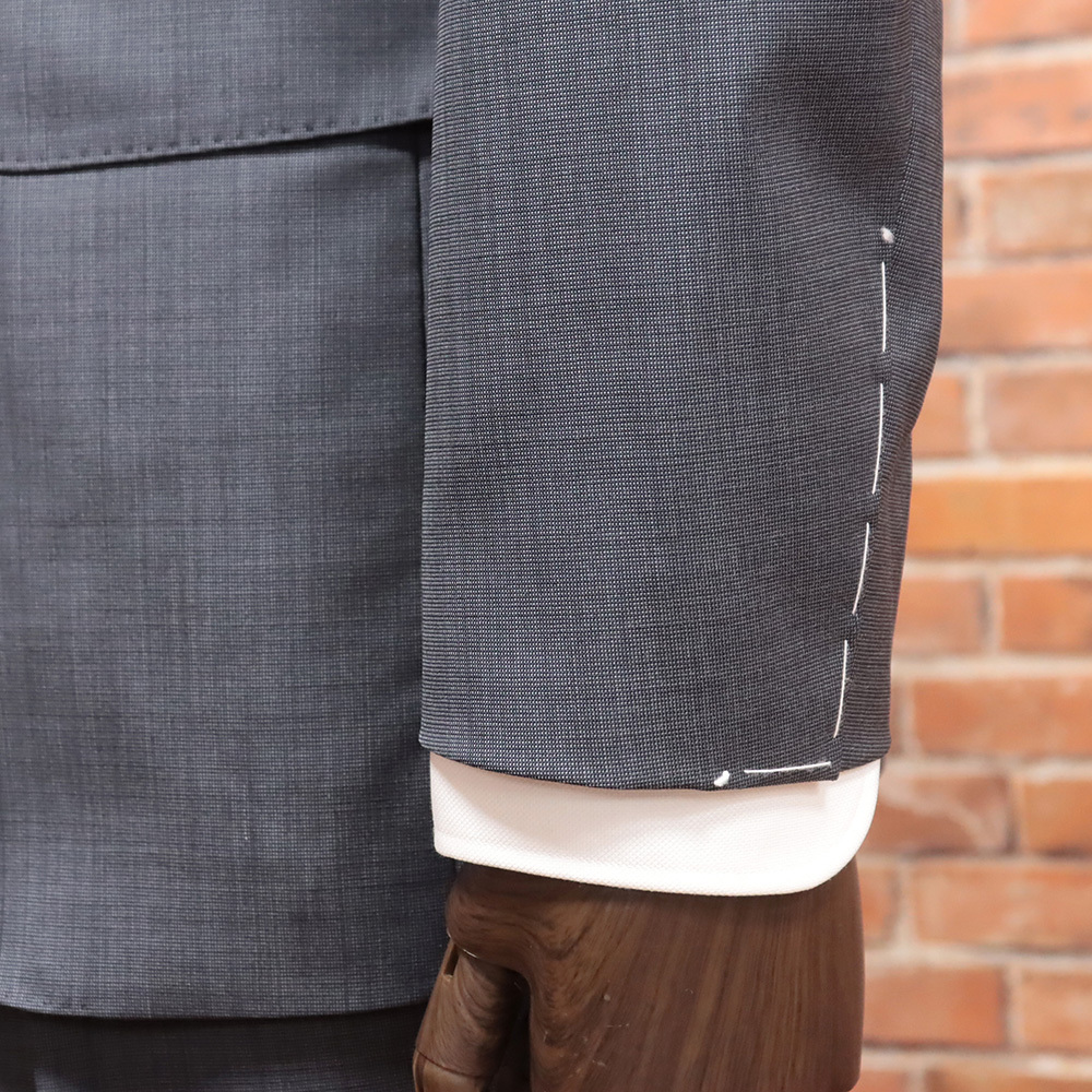 ジャケット:ノーパッド、段返り3ボタン、サイドベンツ、半裏仕立て