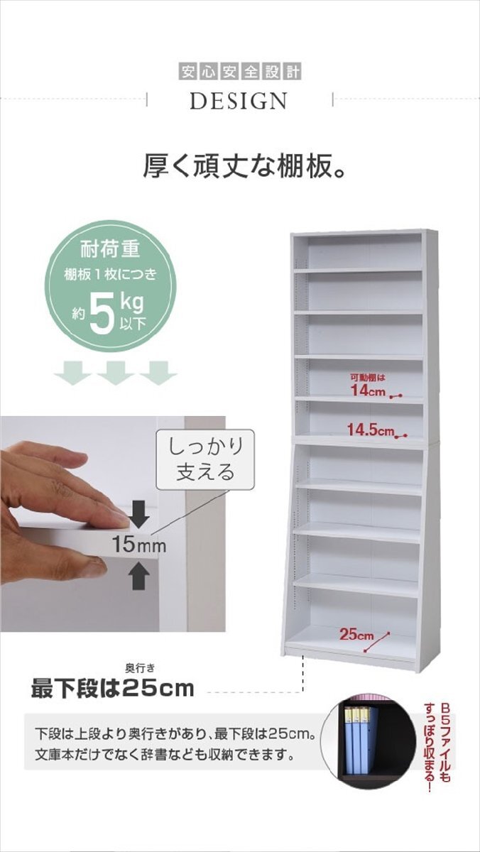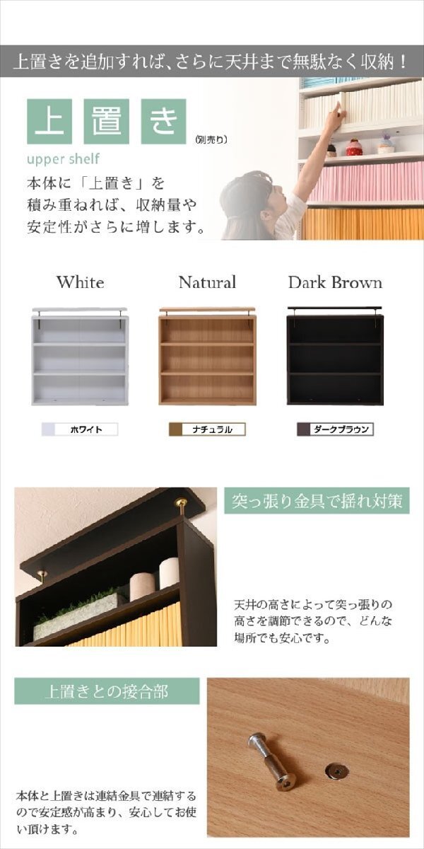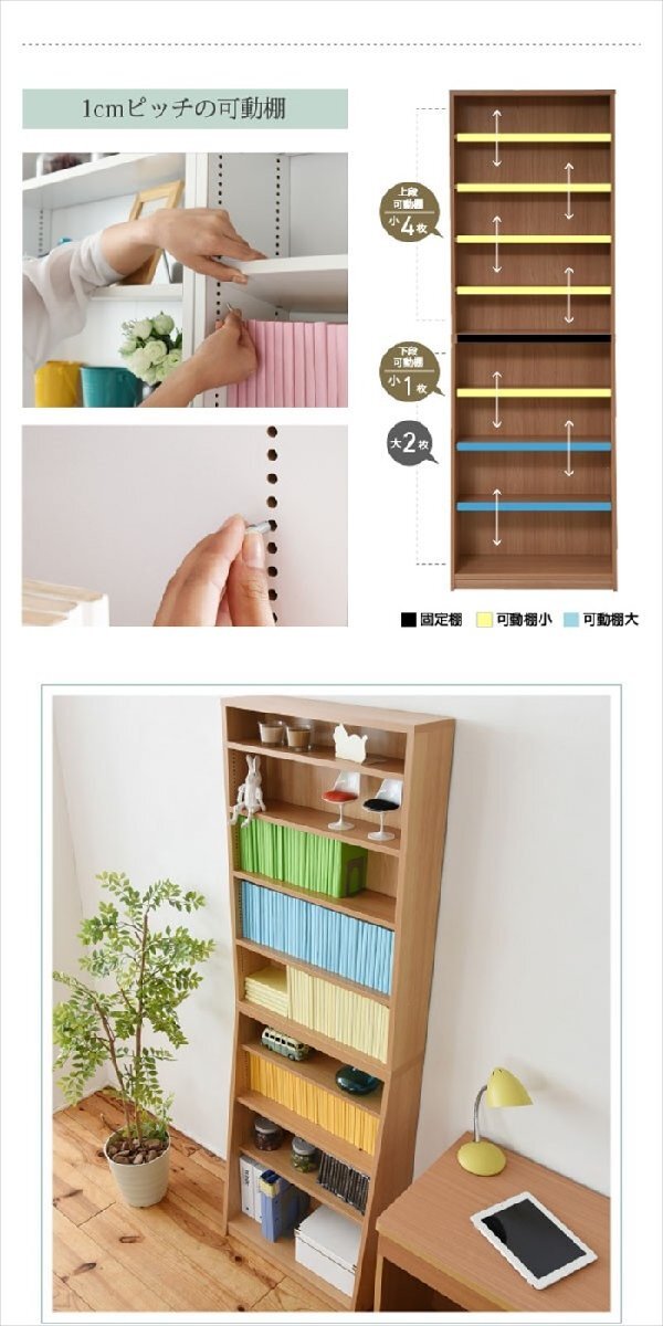 | 棚板を1cm間隔で調整できるので、本だけでなく、ディスプレイラックとして使える万能本棚。 お部屋に合わせて選べる60幅、90幅をご用意。 組み合わせて使えば、120幅、150幅としても使える大容量の文庫本ラック。 薄型なのでお部屋を圧迫せず、スッキリ収納できます。 |