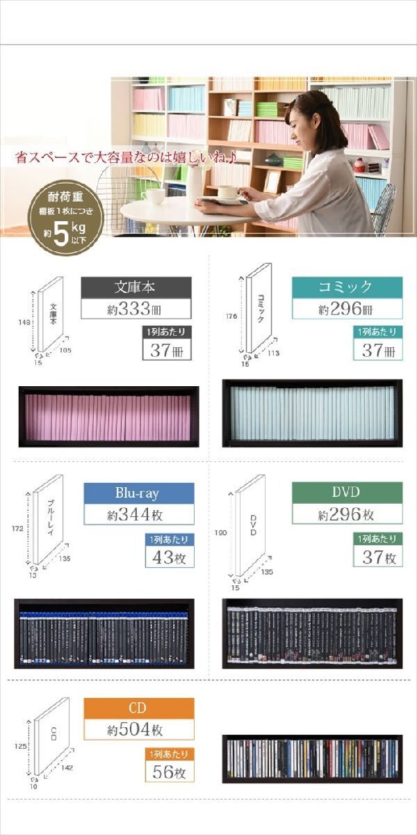 | □耐荷重 [可動棚]5kg以下 □収納量 [文庫本]333冊 [コミック]296冊 [DVD]296枚 [CD]504枚 [Blu-ray]344枚 |
