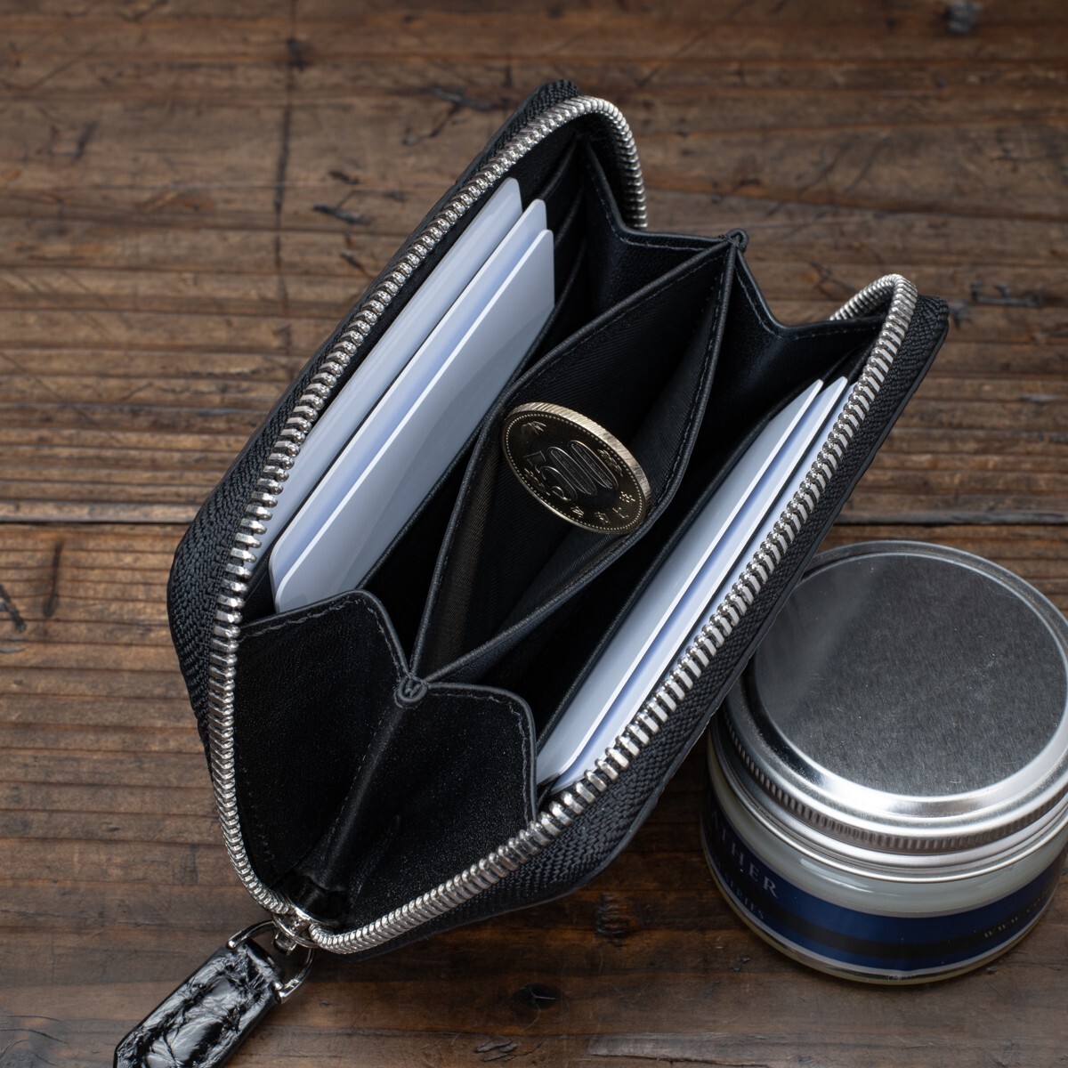 内装には黒の牛革を使い、外装との統一感を高めています。カードや紙幣の出し入れもスムーズで、中央のポケットには少額ではありますが小銭を収めることができます。