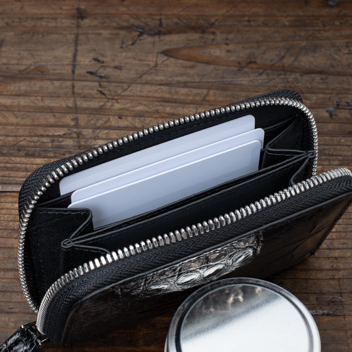 クロコダイルの一枚革をブラックに染めた素材を使っています。真っ黒に仕上げられており、均一で引き締まった表情が特徴です。クロコダイルならではの存在感を持ちながらも派手さはなく、落ち着いた大人の雰囲気が漂います。