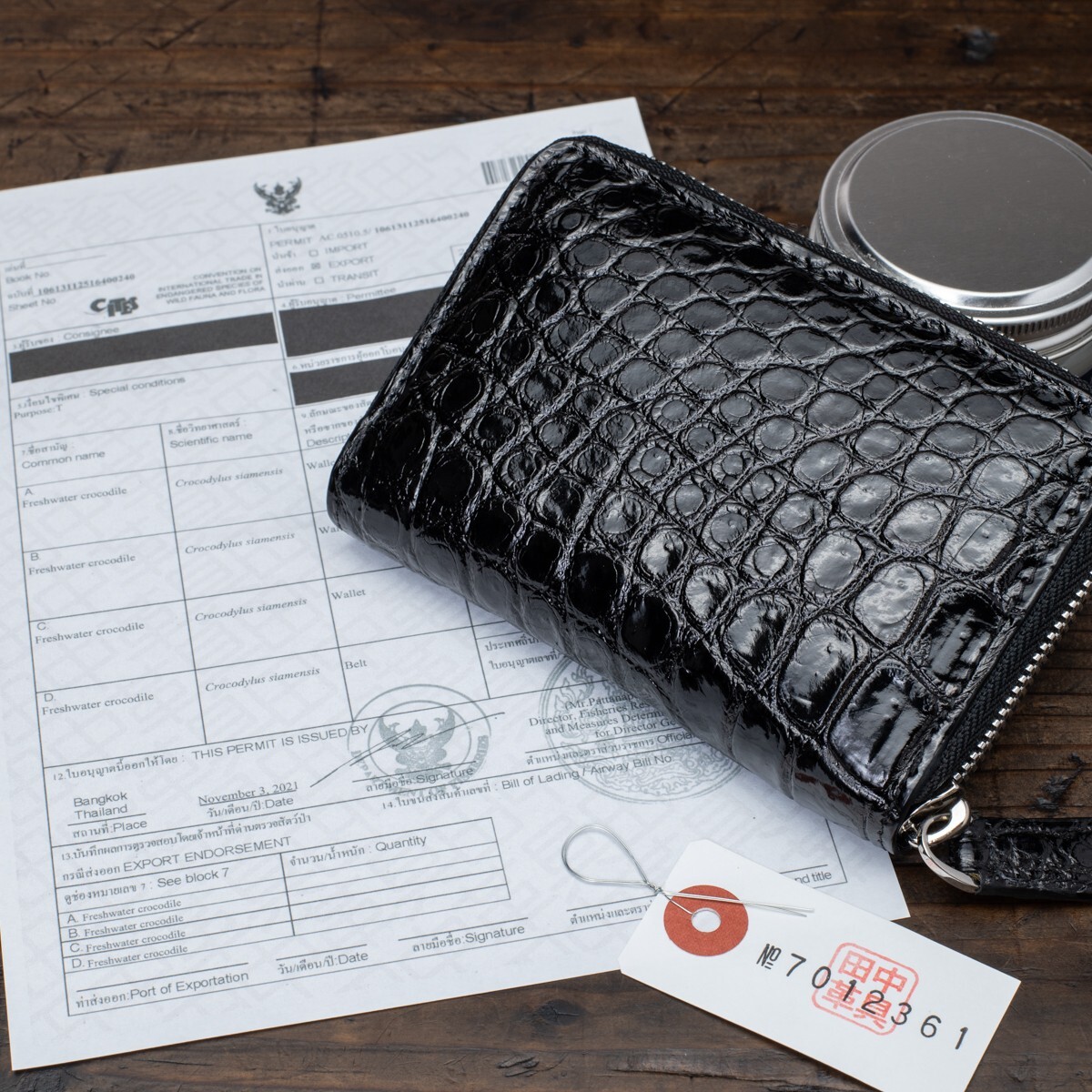 付属の書類はワシントン条約に基づいて発行されるもので、クロコダイルの輸入時に必ず取得が義務付けられています。本物のクロコダイル製品であることの証明として添付しております。
