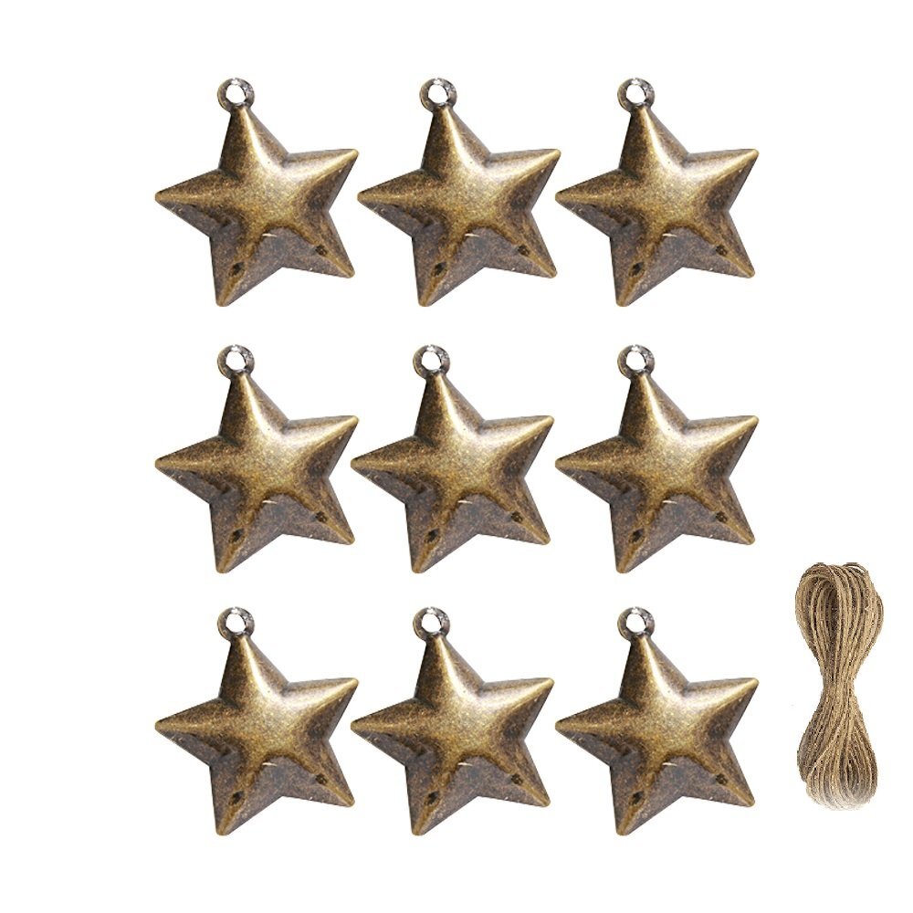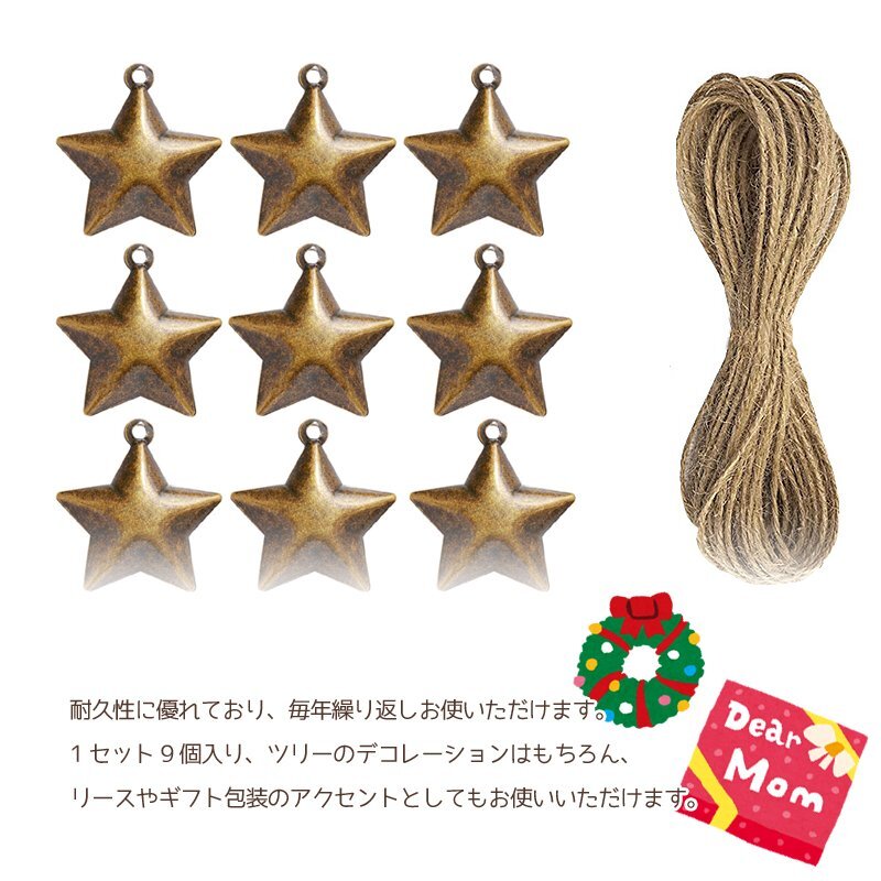 ◆クリスマスベル 9個セット 麻紐付き クリスマスツリー鈴 金属製 装飾用 真鍮色カウベル オーナメント 星型&ツリー型 鈴 お店飾り クリスマス お祭り イベントに【星型】XMASBL09
