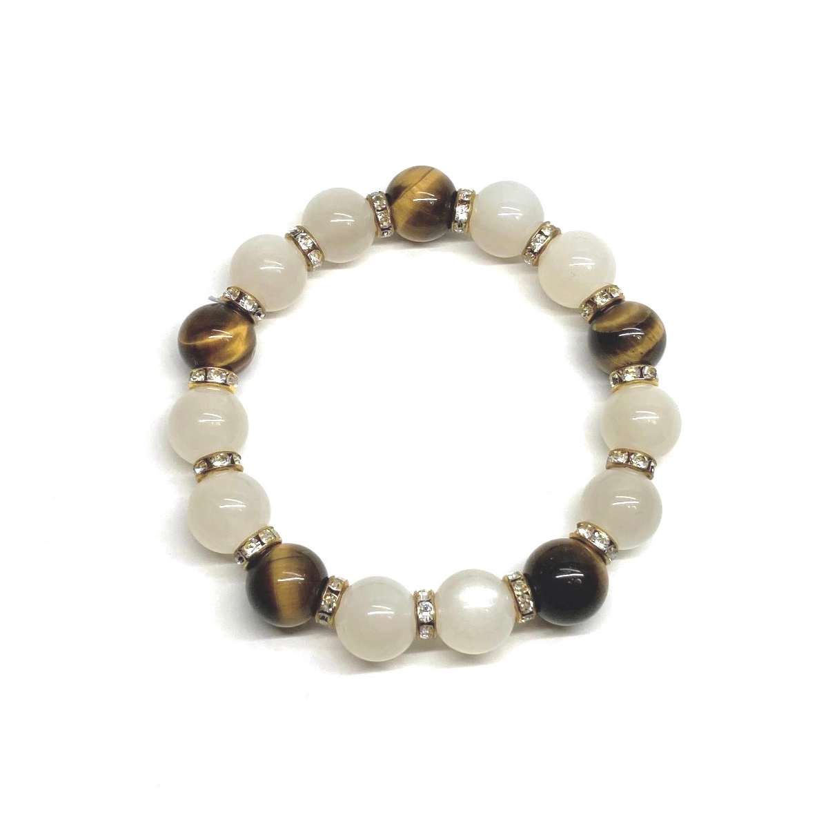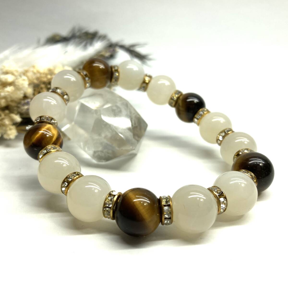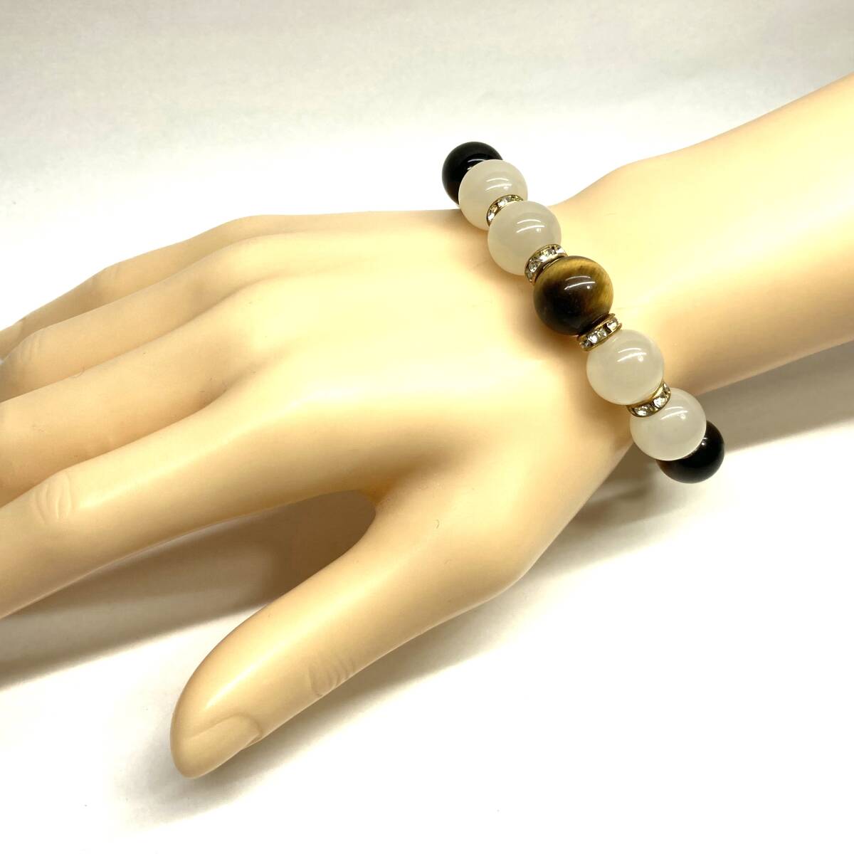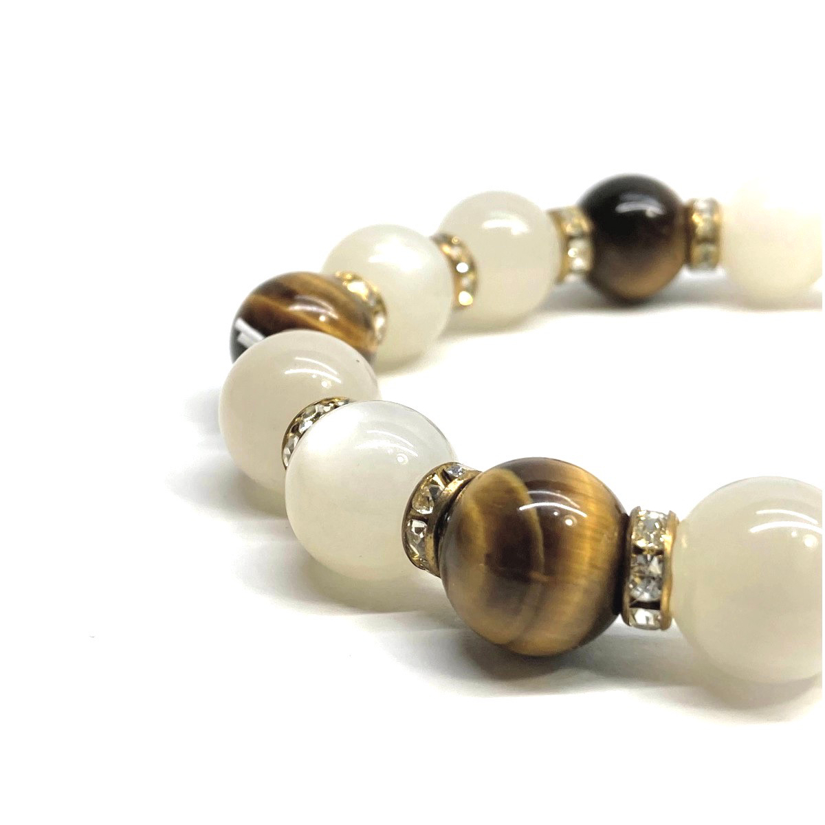 こちらは、ムーンストーンとタイガーアイを組み合わせたパワーストーンブレスレットです。間にはロンデルを挟み高級感あるデザインに仕上げております。程よくインパクトがある12mm玉を使用して内周約18cmです。(サイズ変更の場合は取引ナビにてご連絡をお願いします。) 数に限りがございますので気になる方はお早めにどうぞ。