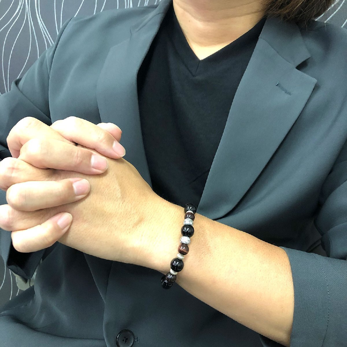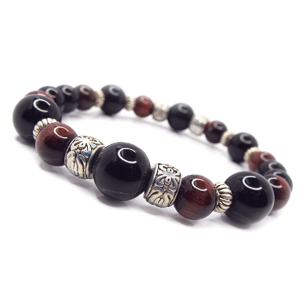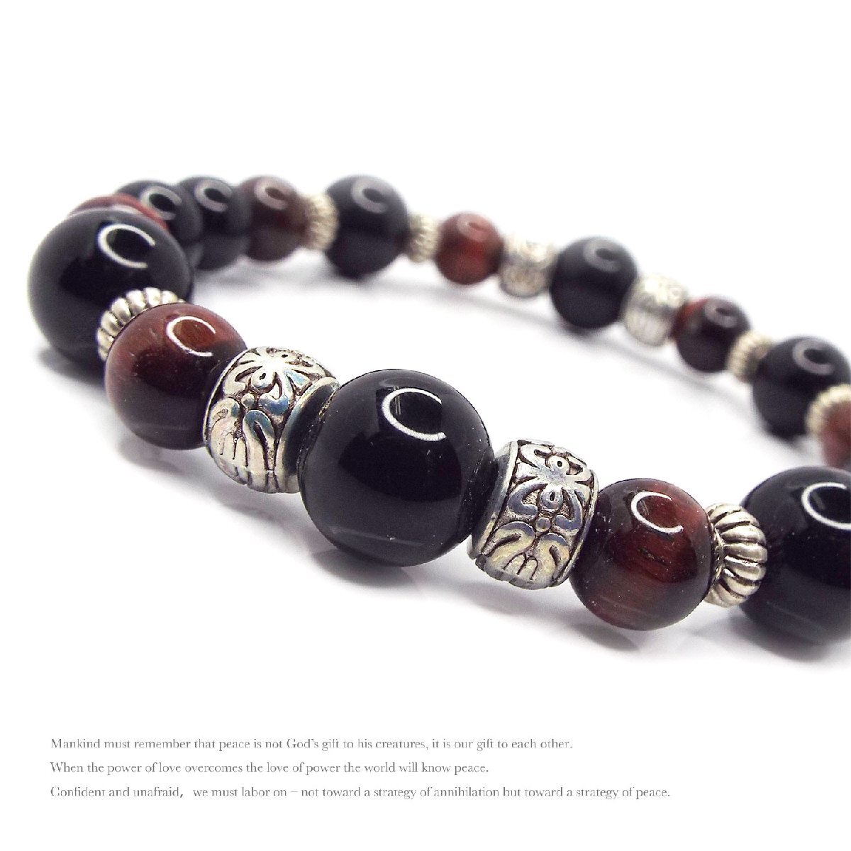 【STONE KITCHEN 天然石 パワーストーン】 金運、仕事運、勝負運、邪気払い?。 男性が求めるパワーを持つストーンと、 クールなデザインの商品を厳選してご紹介! 仕事やプライベート時など、使うシーンを選ばない シックでスタイリッシュなデザイン♪ 忍耐力や意思の強さを与えてくれる石とされるオニキスと 金運、仕事運を引き出してくれるタイガーアイとの組み合わせで、金運UP!! 内周:約18cm 玉サイズ:オニキス 10mm・8mm タイガーアイ 8mm レッドタイガーアイ 1点 注意事項 ※金属部分は汗や汚れ等で変色する場合がございます。気になる場合は 金属磨きや布等で軽くふき取る事をおすすめします。 ※石の種類によっては、艶を引き出すことを目的として、ワックスや着色加工がされているものもあります。 ※表示のサイズは必ずしも最大値・最小値のサイズのものが入っているわけではございません。 ※天然石のため同じものでも色味・模様などが異なります。 ※照明の具合で実際とは色合いが異なる場合がございます。 また、天然素材特有のクラック・内包物を有する場合がございます。予めご了承下さい。 | |||