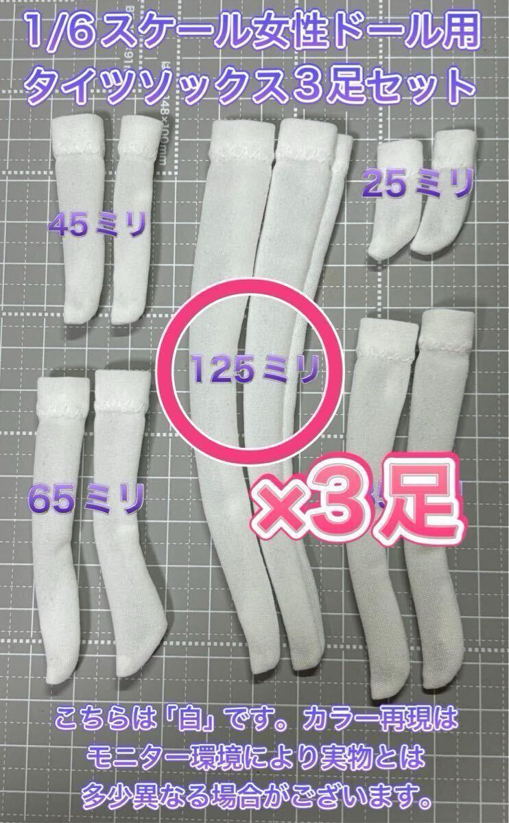 リカちゃん、ジェニー、ネオブライス、アイシードール 、オビツ27女性ボディ、ハッシュタグボディなどが着用出来る、薄手の化繊ソックス長さ違い、平置きで約125ミリの3足セットです。