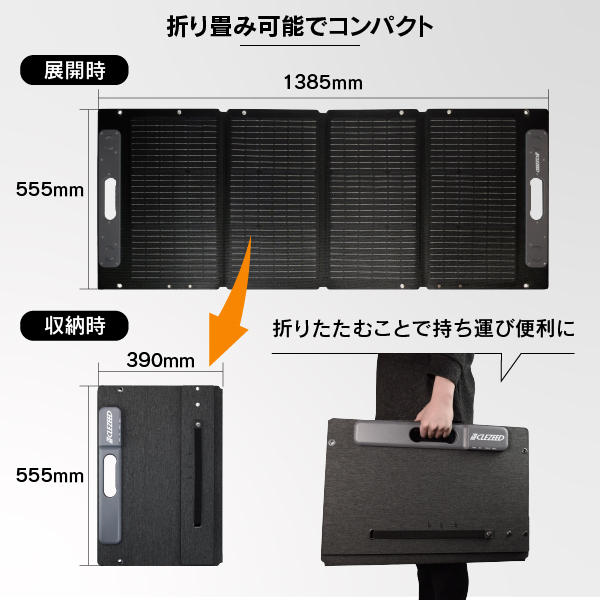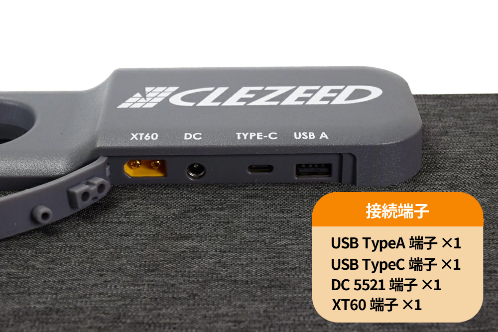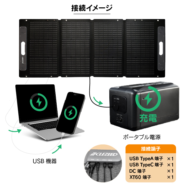 本商品のUSB出力はそのまま使用できますが、 DC出力(XT60出力・DC5521出力)で鉛蓄電池に充電する際には別途ソーラーチャージコントローラーが必要です。 DC出力でポータブル電源に充電することが可能ですが、ポータブル電源の対応電圧・電流が対応範囲内であることやコード形状を確認してください。 ソーラーチャージコントローラーも併せてご検討ください。 |