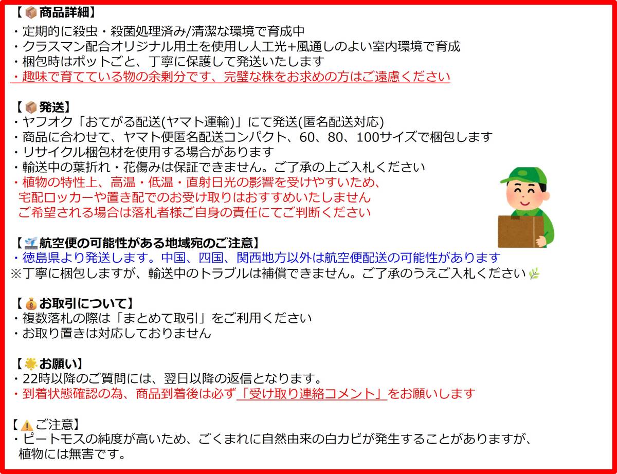 ・商品到着後は、受け取り連絡(必須)とあわせて、株の状態についてひと言コメントをいただけると安心です。植物のため輸送中の環境変化が心配なため、ご協力いただけると助かります。