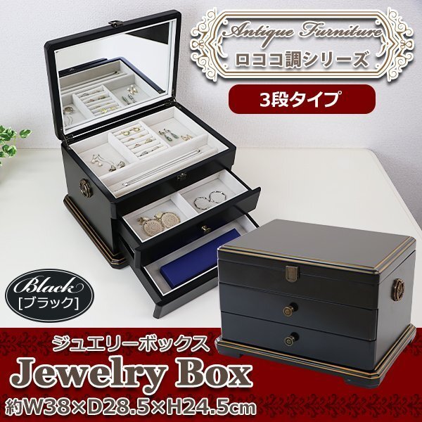 商品名 | 送料無料 ジュエリーボックス アクセサリーケース 3段 ブラック 約W38×約D28.5×約H24.5(cm) 種類や大きさに合わせて細かく仕分けできる ドレッサー 木製 ロココ アンティーク おしゃれ レトロ 大容量 鏡 ミラー アクセサリー ジュエリー 収納ボックス 黒 rococof123bk |