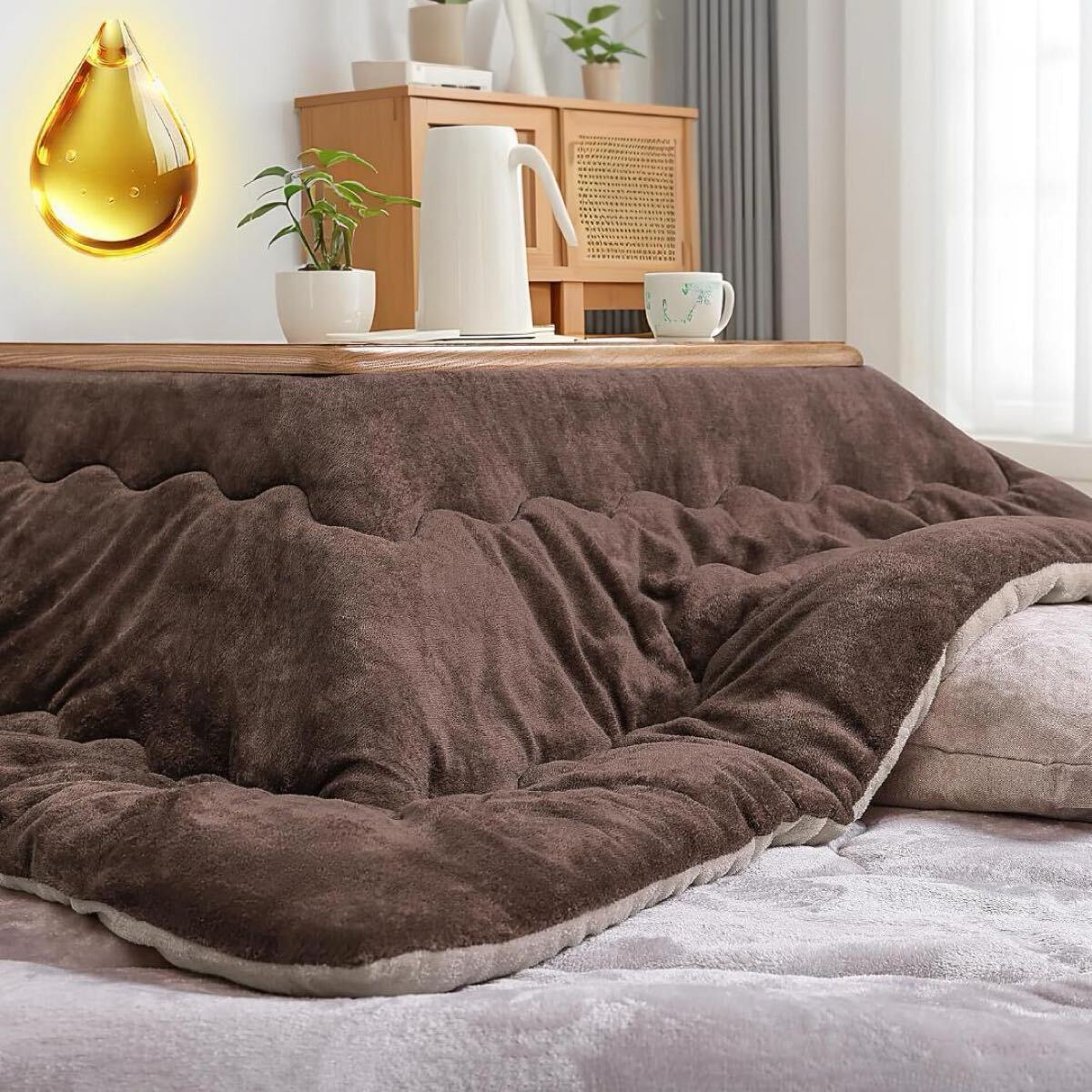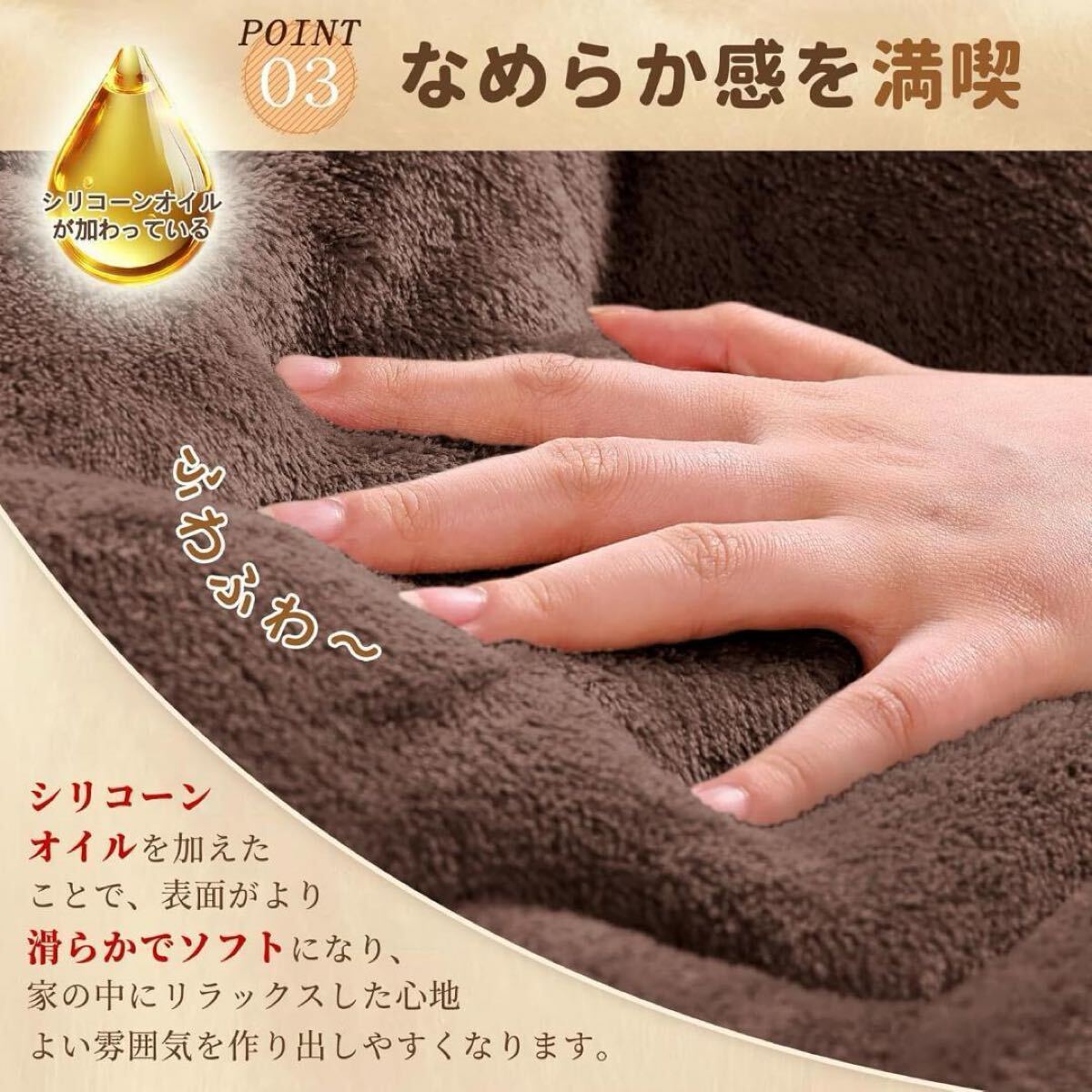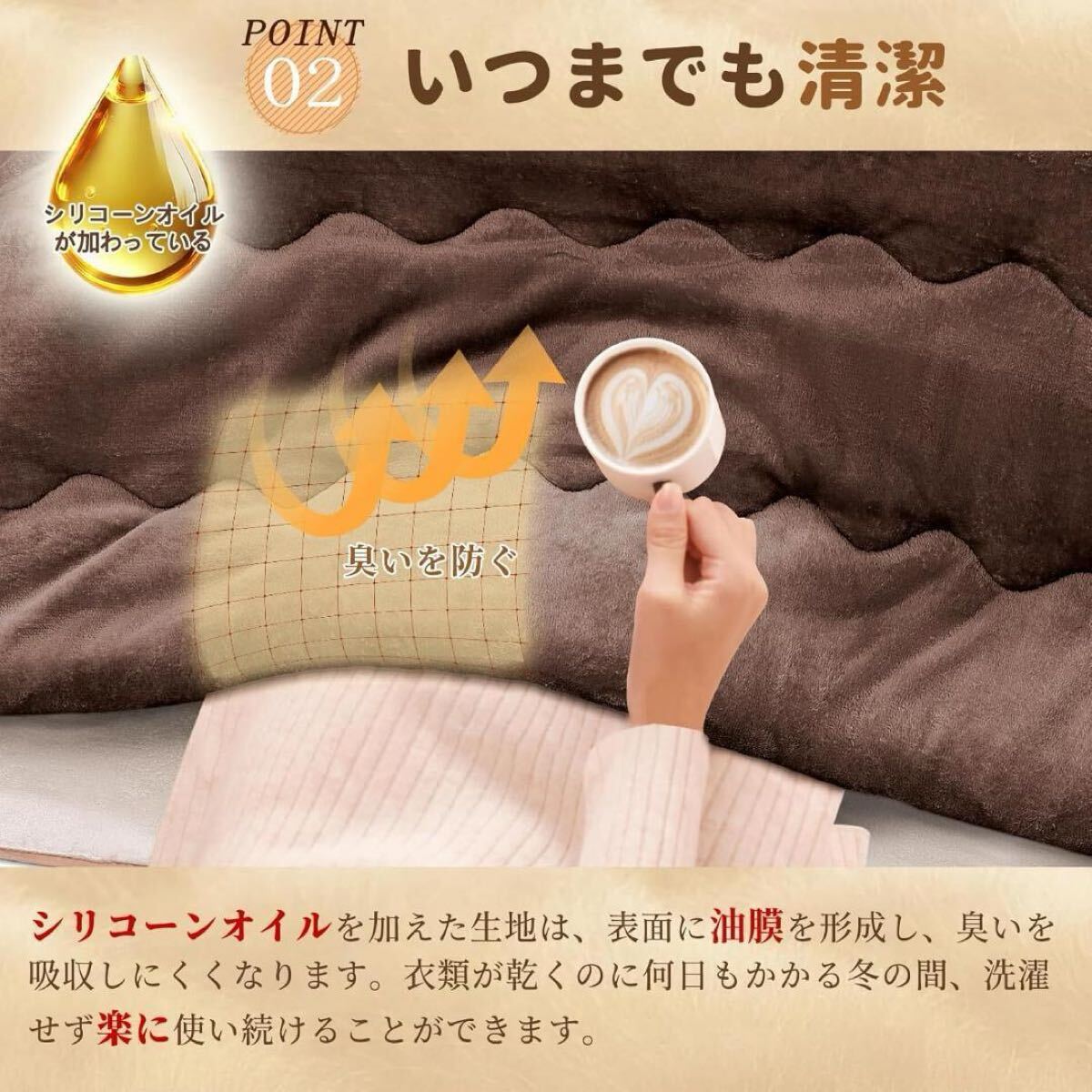 【シリコーンオイルが加わっている】こたつ布団の糸にシリコーンオイルを加えるという革新的な方法により、こたつ布団はより滑らかで柔らかくなり、同時に静電気が起こりにくく、臭いを吸収する力も弱くなりました。他の普通のこたつ布団より、より一層の幸福感をもたらしてくれます。