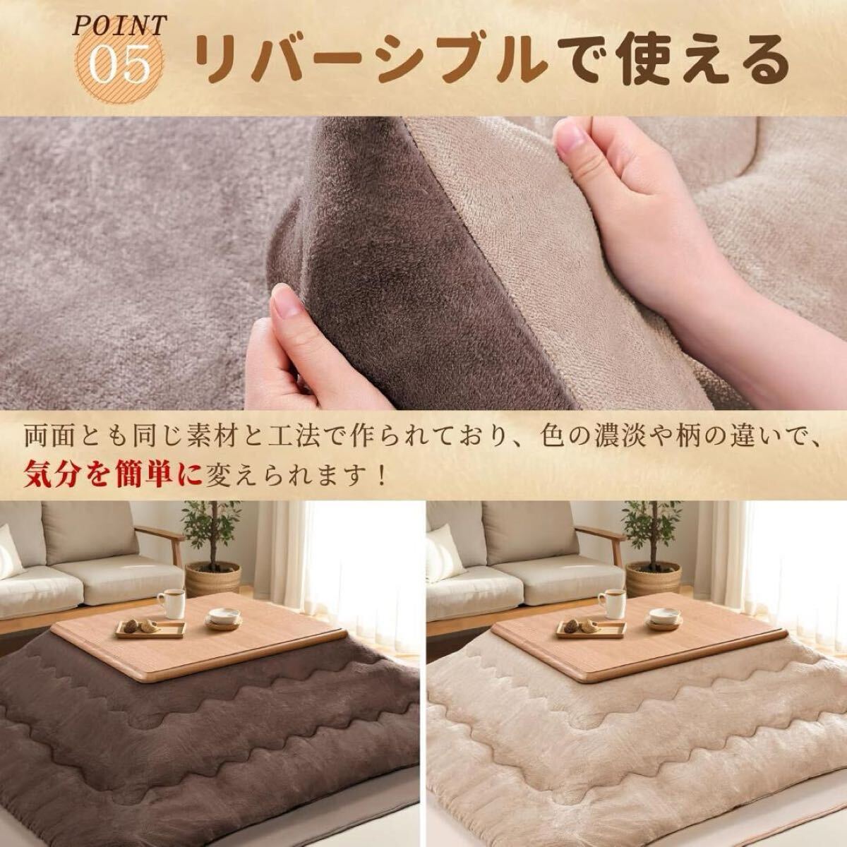 【お手入れが簡単で撥水加工】本品のこたつ布団は毛足が短めのフランネルを使用しているため、ゴミが絡みにくく、お掃除が簡単にできます。汚れたら、ご自宅の洗濯機で丸洗いできます。こたつ布団に波型のキルト加工を採用しており、洗濯機で洗っても中綿がズレにくいです。お手入れが簡単で、いつでも清潔、快適にお使いいただけます。