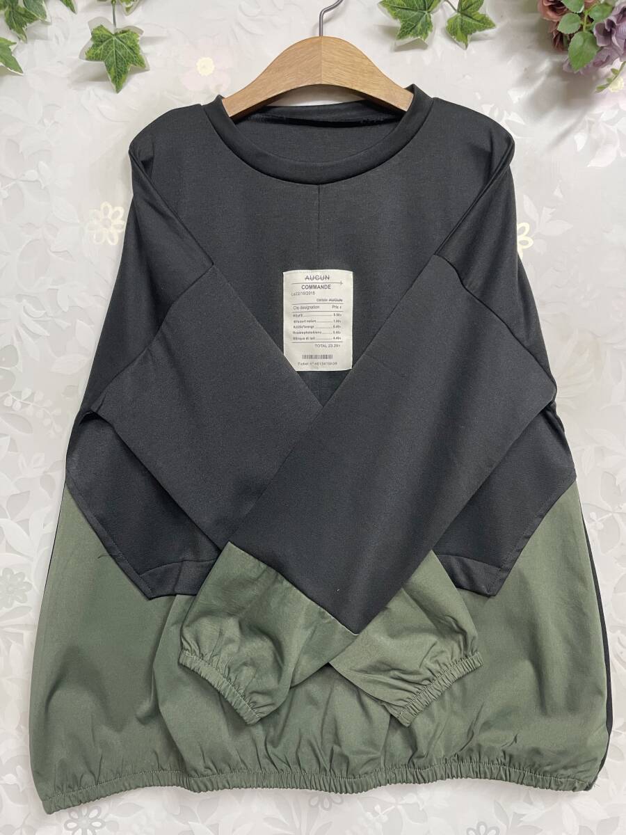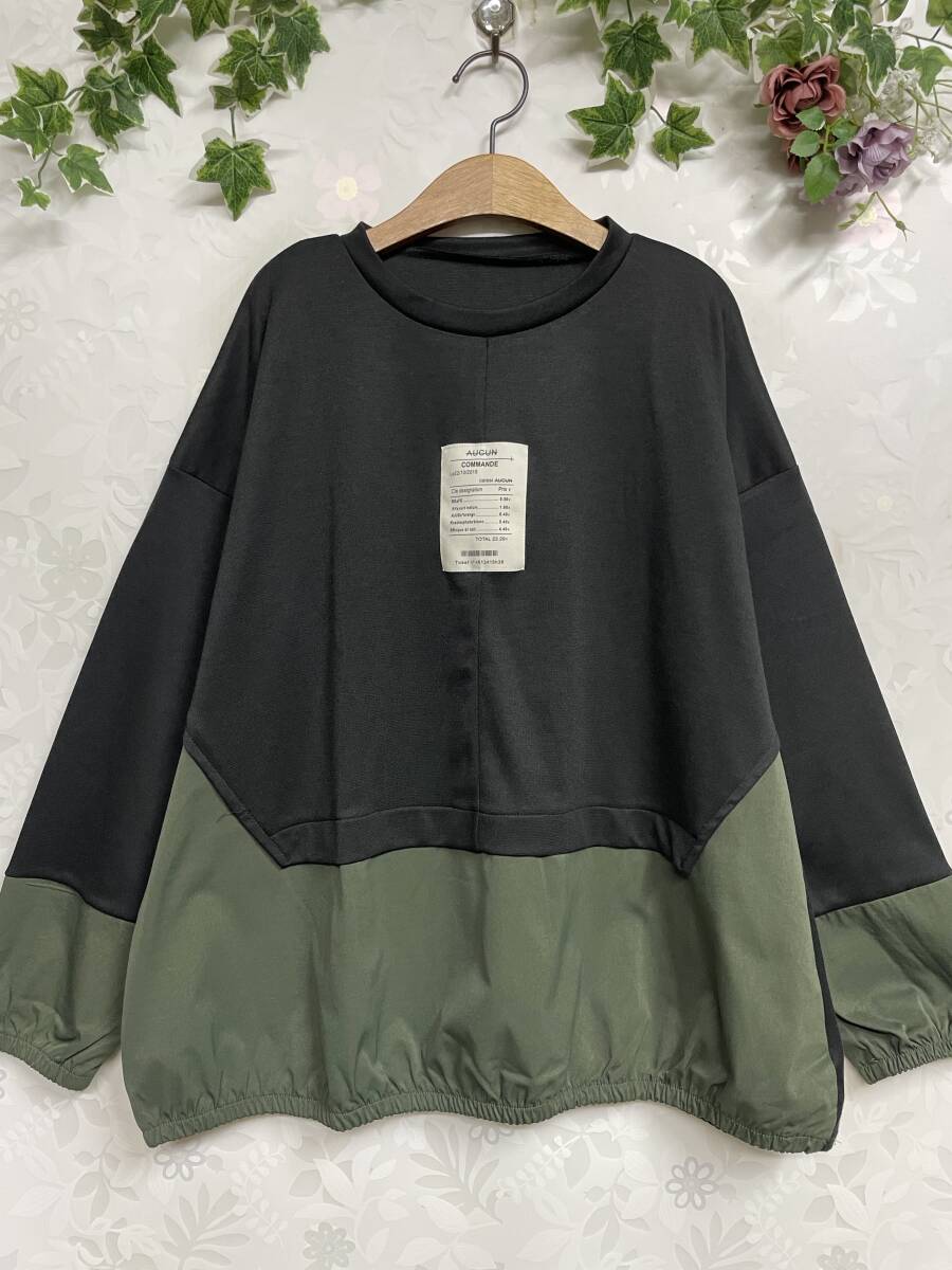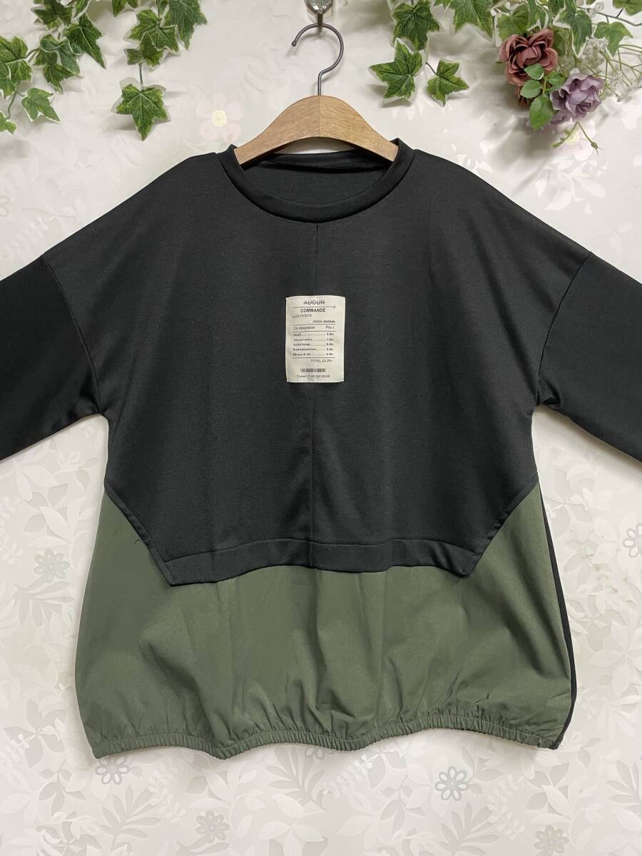★新品 異素材切り替え 重ね着風 バルーンシルエットトップスM~L(BK×KH)