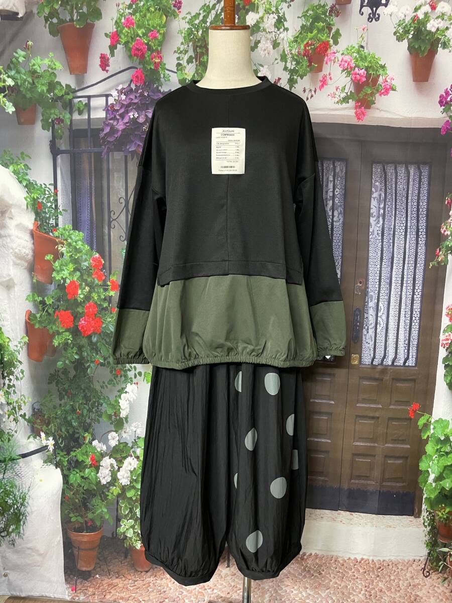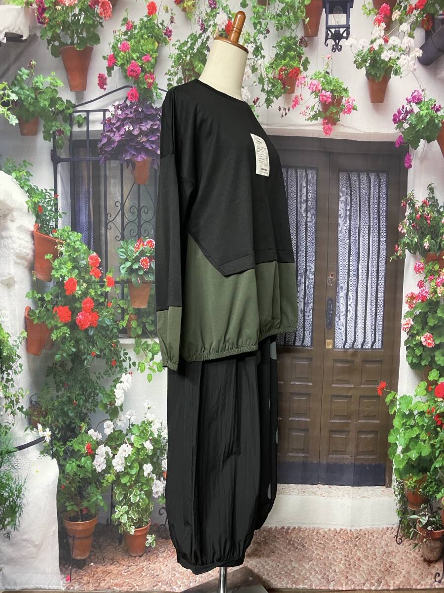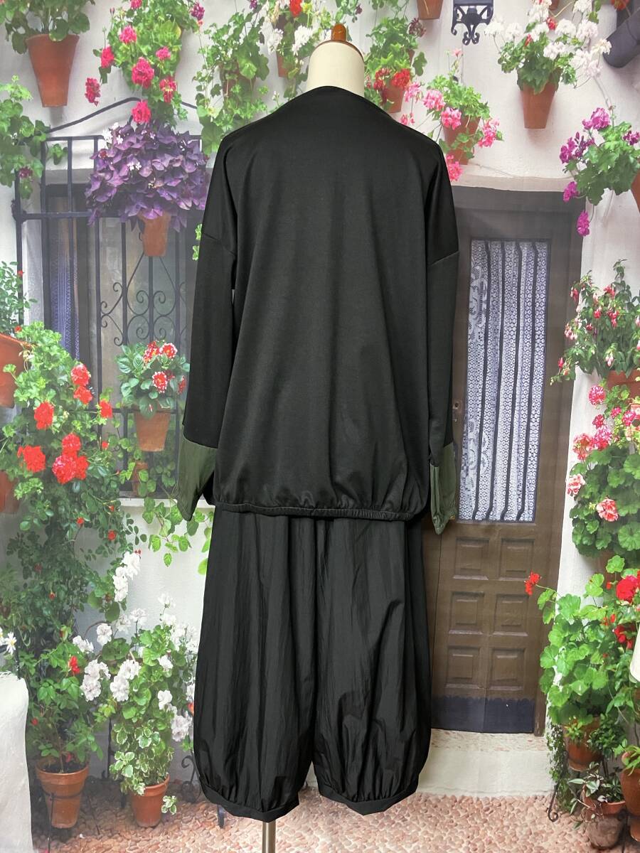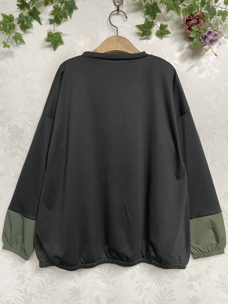 ★新品 異素材切り替え 重ね着風 バルーンシルエットトップスM~L(BK×KH)