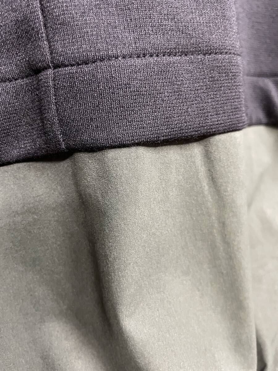 ●普通地のポリストレッチカットソー素材と袖と袖口は、若干新種のあるポリ地の切り替え。