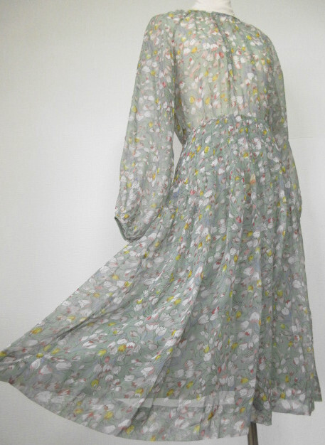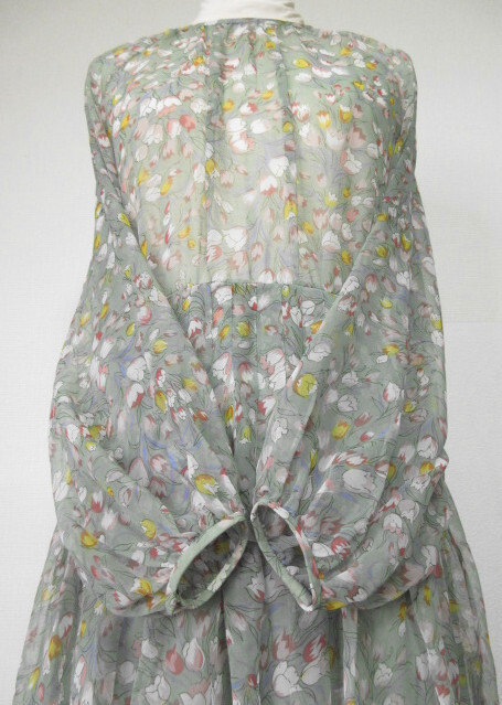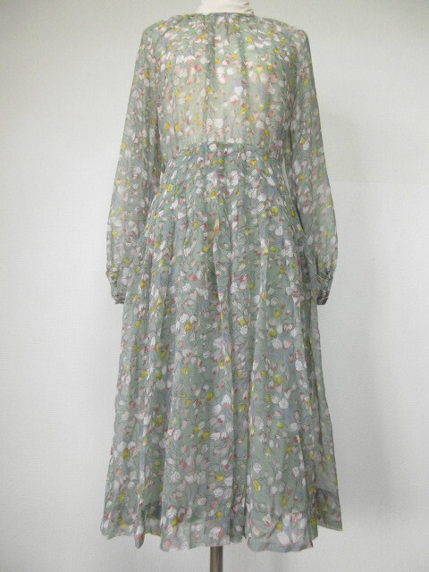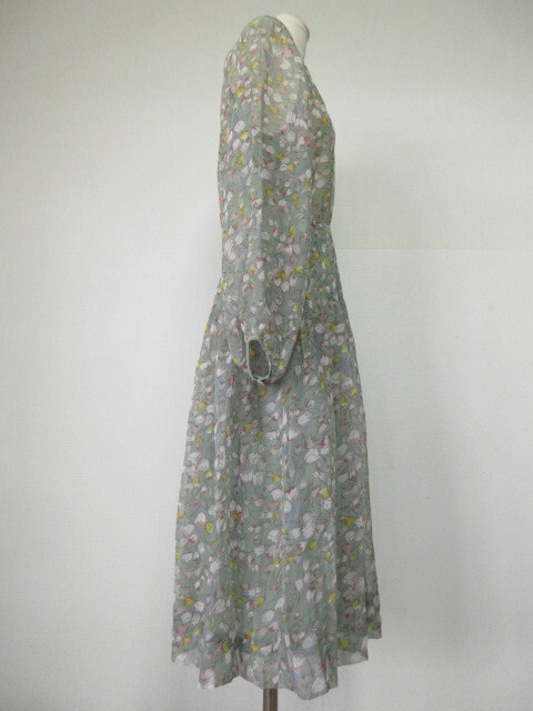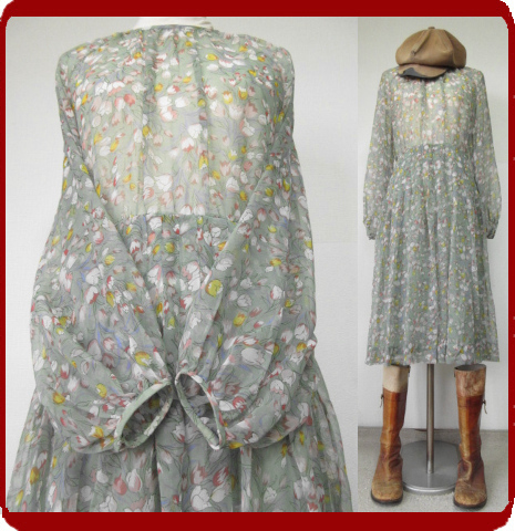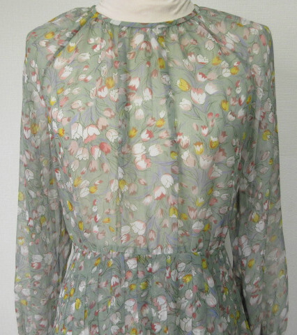 古着♪レトロ・Vintage緑花柄シフォンワンピ♪70s60s70年代60年代80年代ヴィンテージアンティーク昭和ロマン日本製長袖秋冬即決フレンチ