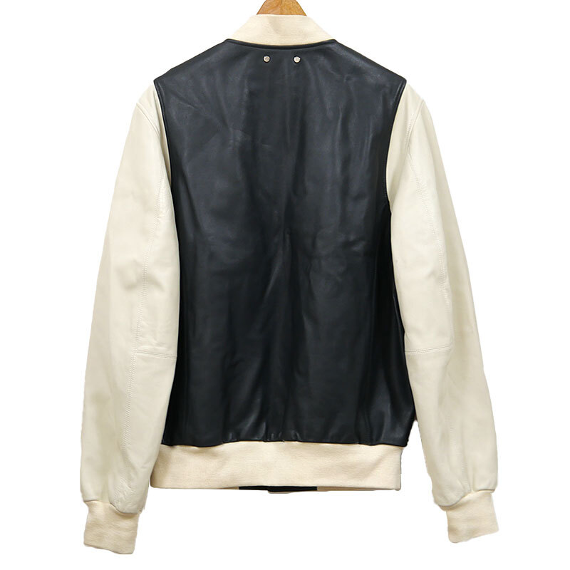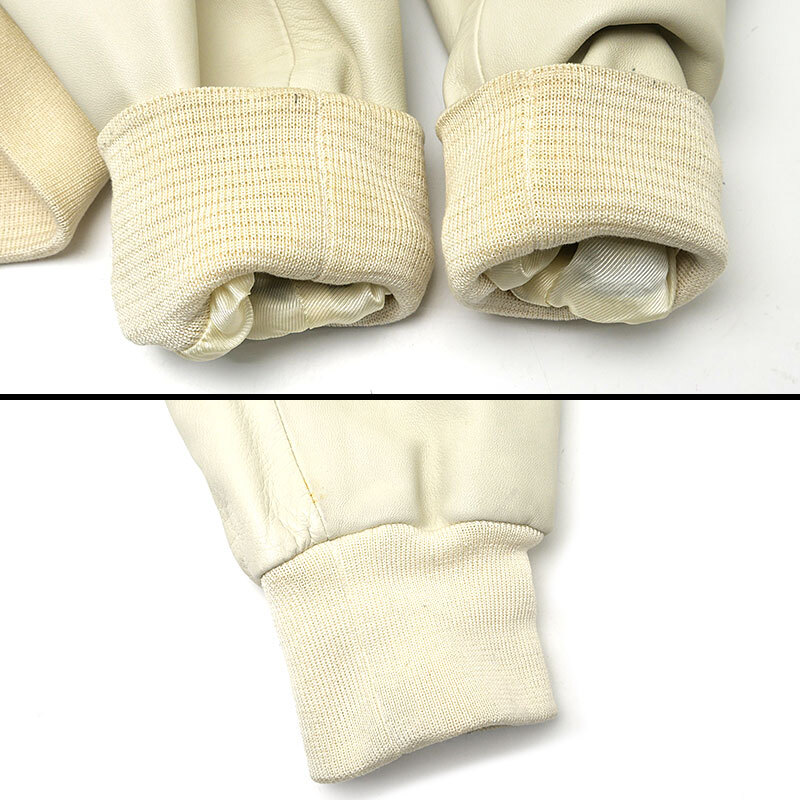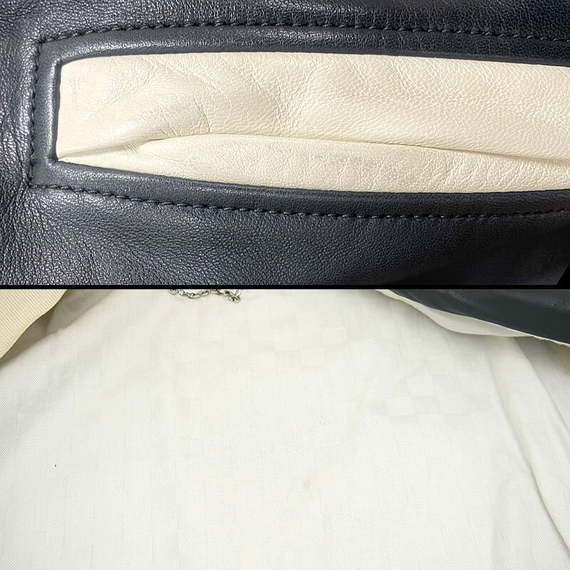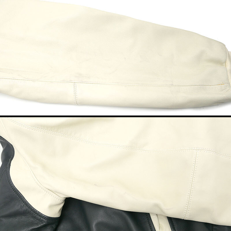【表】腕部分にシミ汚れや黒い汚れあり。ポケット部分にも多少の黒い汚れあり。袖に黄ばみや汚れ。黒いレザー部分は多少のスレや僅かな色褪せが感じられますが、大きなダメージはございません。
