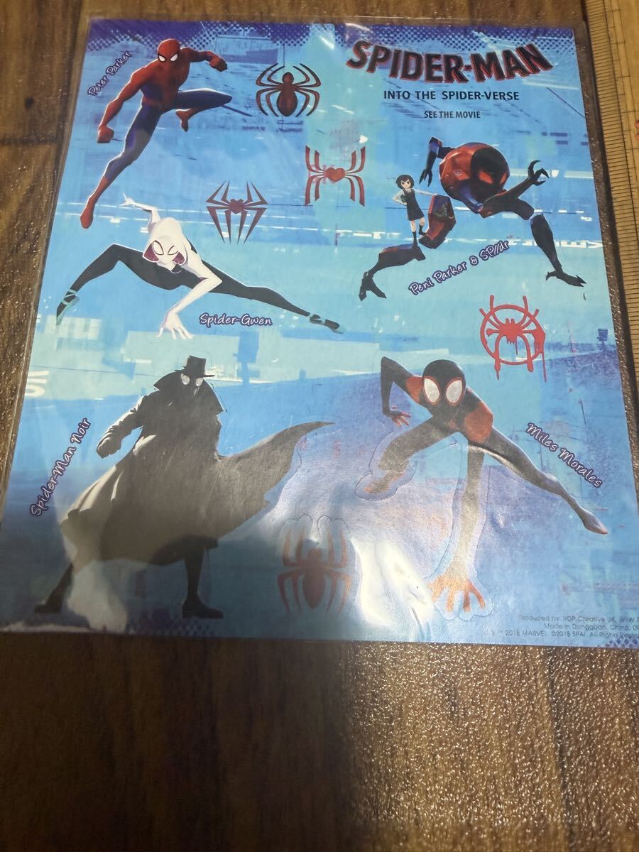 【商品の状態】映画**『スパイダーマン:スパイダーバース』**のキャラクターが描かれたステッカーシート非売品マイルズ・モラレス、グウェン・ステイシー、スパイダーマン・ノワール、ペニー・パーカーなどが描かれています。