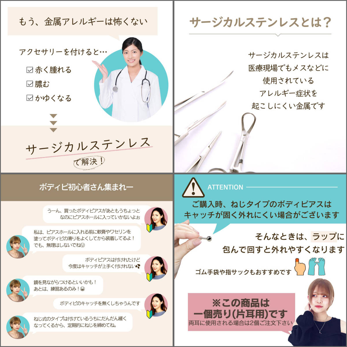 金属アレルギーの症状を起こしにくい素材サージカルステンレスを使用しております。