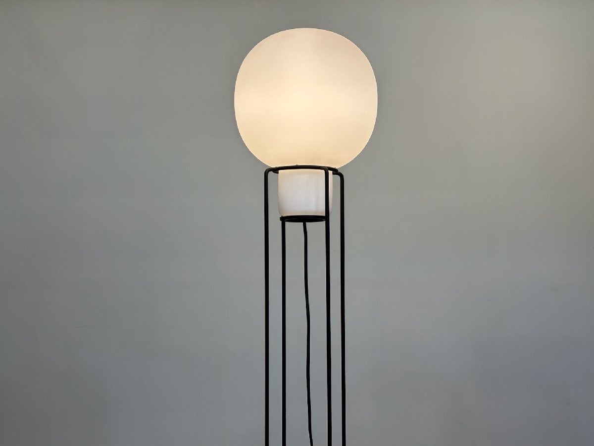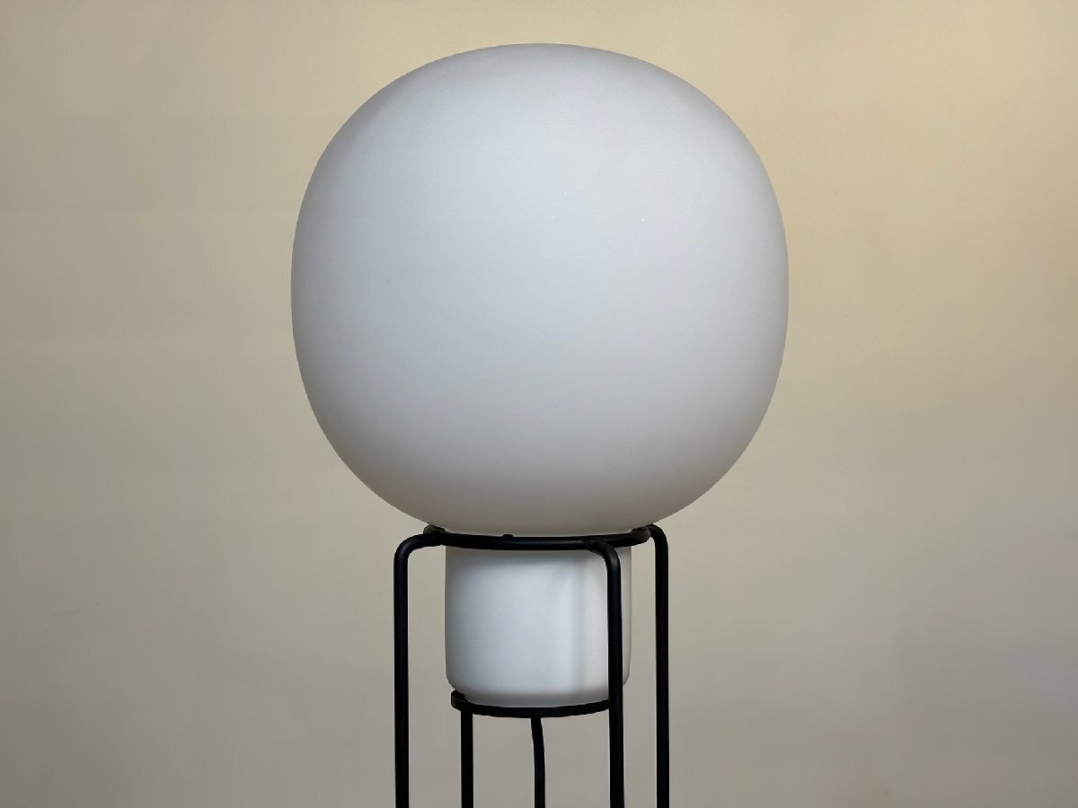 縦状に多少円柱状に伸びたマットな質感の柔和なボールセードが、ほっそりとしたフレームに差し込まれた建築的なシルエットで、凛とした静かな佇まいにインダストリアルなモダニズムテイストを織り交ぜたジャパンモダニズムの傑作として君臨する名作フロアスタンドライト。yamagiwa / 1980sヴィンテージ品のご提案。