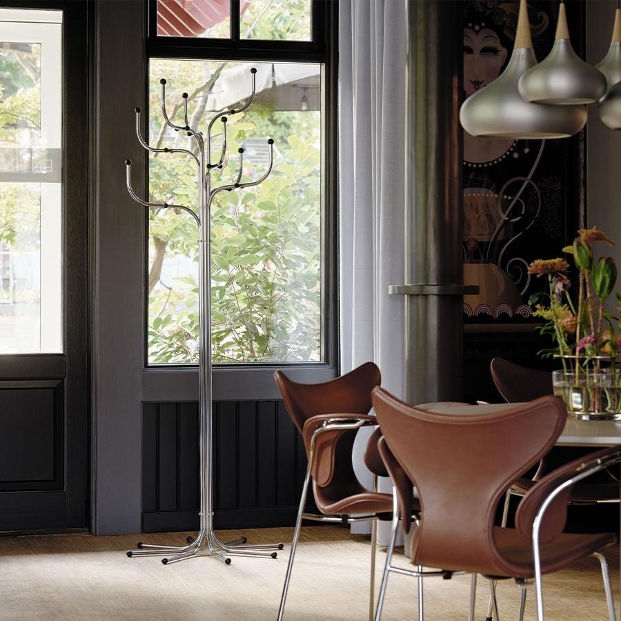 自然情緒を感じさせるスカンジナビアンテイストとクロム塗装によるグロッシーなライン美のほっそりとシャープな立ち姿で、可憐さと雄々しさを具有させたハンガーラッククリエイションの傑作として、デザイン史に不滅のリーディングケースとして君臨する不動の名作ラック。Fritz Hansen より。