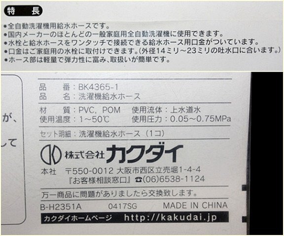 ・カクダイ 全自動洗濯機給水ホース (BK4365-1)・・・1点