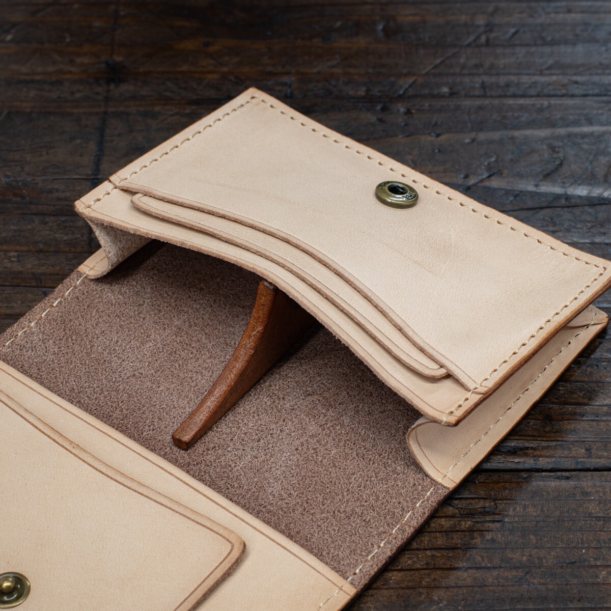 縁まわりはコバを丁寧に磨いて仕上げており、見た目の美しさだけでなく、革の断面からの劣化も防いでいます。ホックには阿部ハトメ社製の「THKホック」を採用し、バネがへたりにくく、しっかり留まる安心感があります。