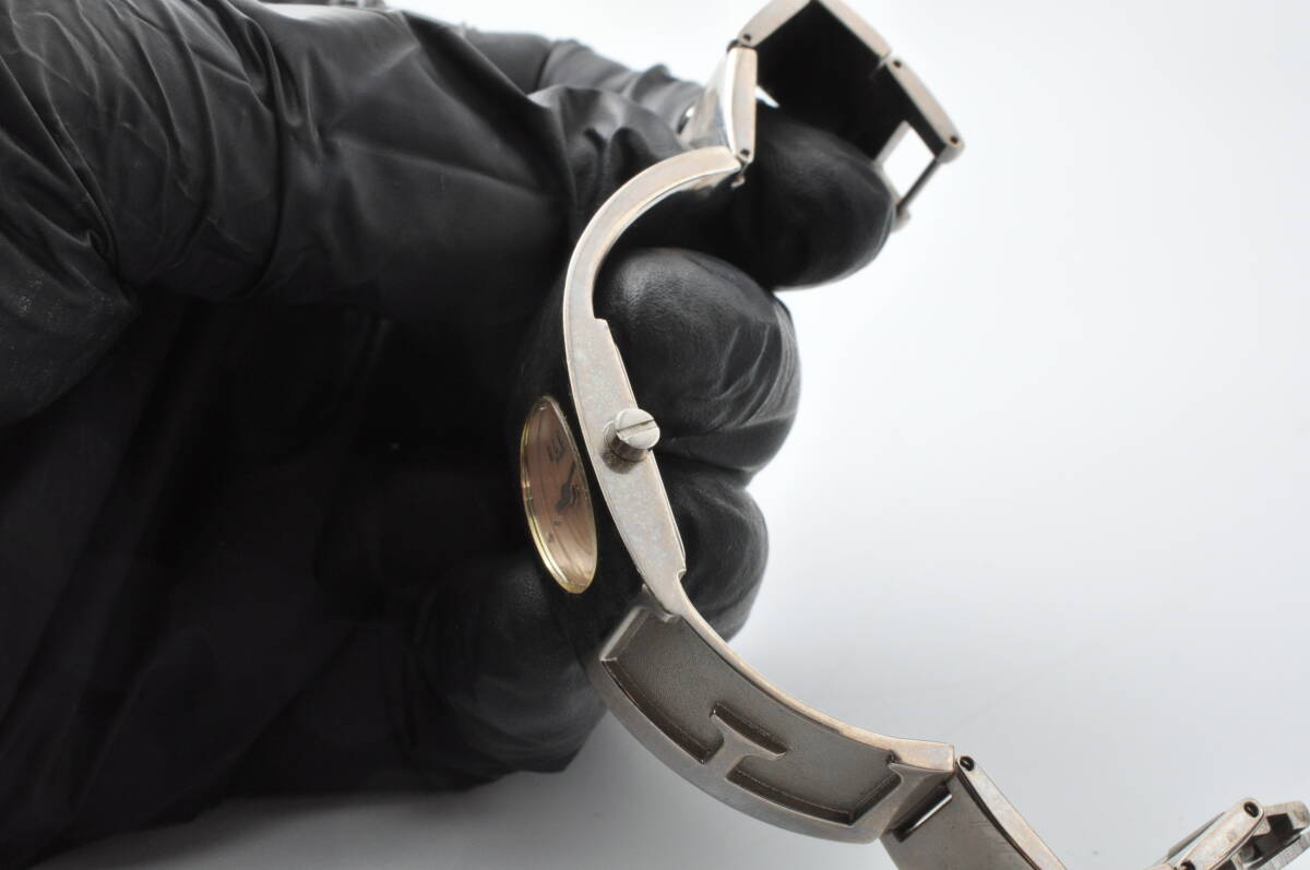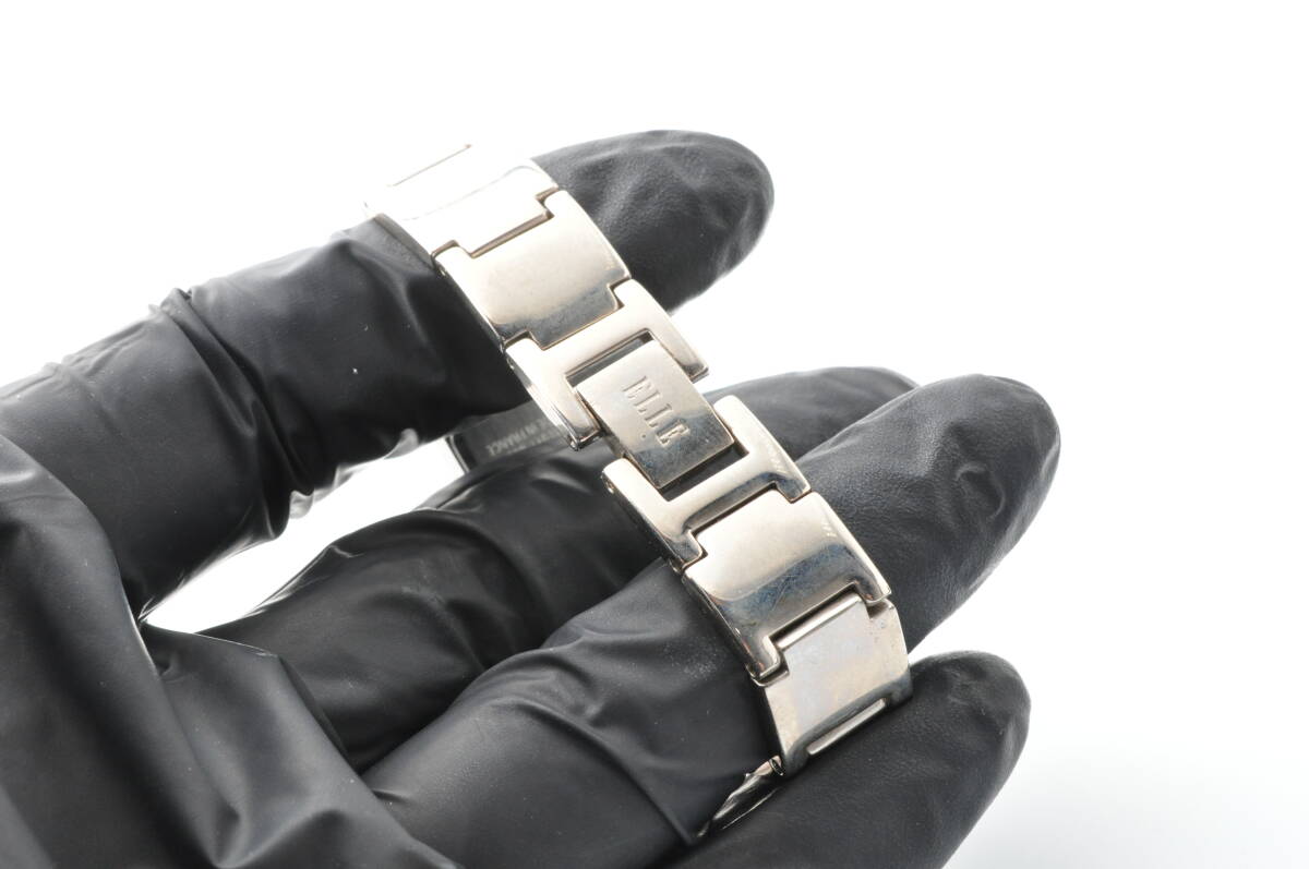 | ★商品説明★ | 商品説明 フランスのファッションブランド、**ELLE PARIS(エル パリ)** のスタイリッシュなレディースクォーツウォッチです。 時計というよりは、**アクセサリー(バングル)** のようなデザインで、普段のコーディネートを華やかにしてくれます。 デザイン: 非常に細身のバングルタイプです。 ケースが横長で、ブレスレットに「E」をモチーフにしたような カットワークが施されています。 文字盤: 淡いピンクベージュ系のオーバル型(楕円形)文字盤です。 裏蓋刻印: **「MADE IN FRANCE」**の記載があり、 フランス製造の希少なモデルと思われます。(Water Resistant 50M) 状態: 全体的に使用に伴う小傷や変色が見られます (特に裏蓋やブレスレットの裏側)。 リューズは回ることを確認しました、電池交換済み。 商品詳細 項目詳細 ブランドELLE PARIS (エル パリ) ムーブメントクォーツ (アナログ2針) 文字盤の色ピンクベージュ系 ケース形状オーバル型 (横長楕円) 防水性能WATER RESISTANT 50M (裏蓋記載) 製造国MADE IN FRANCE (裏蓋記載) 腕周り約13.5cm (計測画像より判断。余りコマなし) 付属品なし (本体のみ) バングル裏側や、金具の可動部分を中心に変色や使用感があります。 ヴィンテージ品としてご理解ください。 腕周りが約13.5cmと非常に短めです。 ご購入前に必ずご自身の腕周りをご確認ください。 サイズ調整用の余りコマは付属しません。 付属品 付属品はありません。 電池交換済み ※画像のものがお譲りする全てとなります。 |