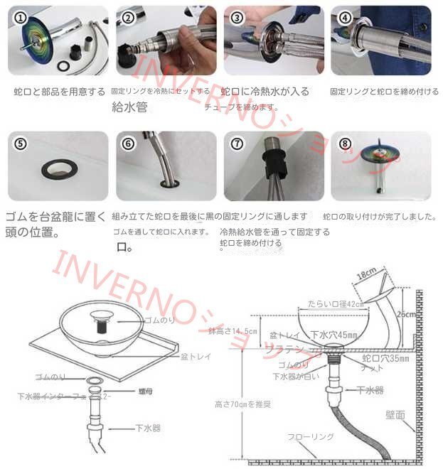 【各部品サイズ】洗面ボウル本体:T12*450*450*110mm、水栓サイズ:185*285mm、ボール取付穴:45mm、水栓取付穴:32-35mm