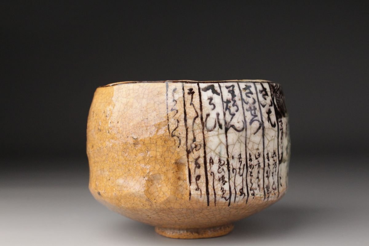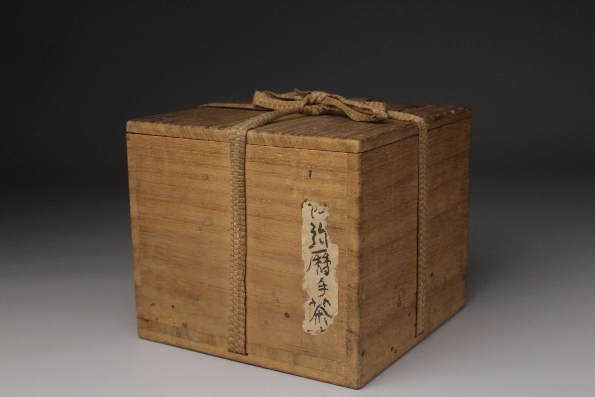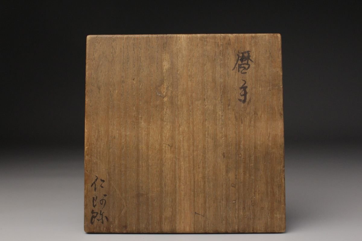* * * 商品詳細 * * * ここでしか出逢うことのできない唯一の美をご紹介させて頂きます。 二代 高橋道八(仁阿弥)作 暦手茶碗 江戸時代後期、仁阿弥こと二代高橋道八(17831855)の手による希少な暦手茶碗。長石釉を薄く掛け、文字が連続して描かれる暦手の意匠は、写し物を基盤に独自の色絵表現を確立した道八の作域を端的に示しています。 手捏ねにより成形され、箆で整えられた丸みを帯びた器形は素朴でありながら品格を失わず、やや低めの高台や時代による虹彩が、時代の息遣いと風格を伝えます。箱書には墨書で「暦手 仁阿弥」と記される時代箱が添い、来歴の確かさを物語ります。 煎茶席はもちろん、研究資料やコレクションの中心となるにふさわしい一碗です。稀有な作域を示す逸品を、ぜひじっくりとご堪能ください。 ■商品内容/ 茶碗、時代箱 ■サイズ/横11.5㎝×高8.5㎝ 箱:横14㎝×高12㎝×奥行14㎝ ■状態/ スレ、小傷、汚れ、箱にスレ、傷、汚れがございます。 ※写真にてご確認、ご了承の上ご入札下さい。