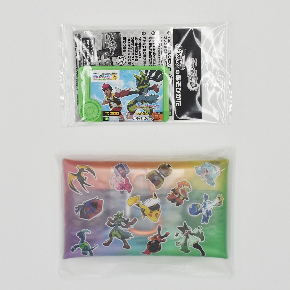 黄色いメガルカリオのフレンダピックと、ポケモンたちがデザインされたスペシャルクリアマルチケースの2点がセットになっています。