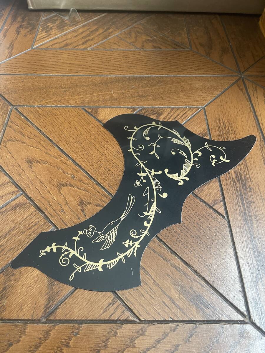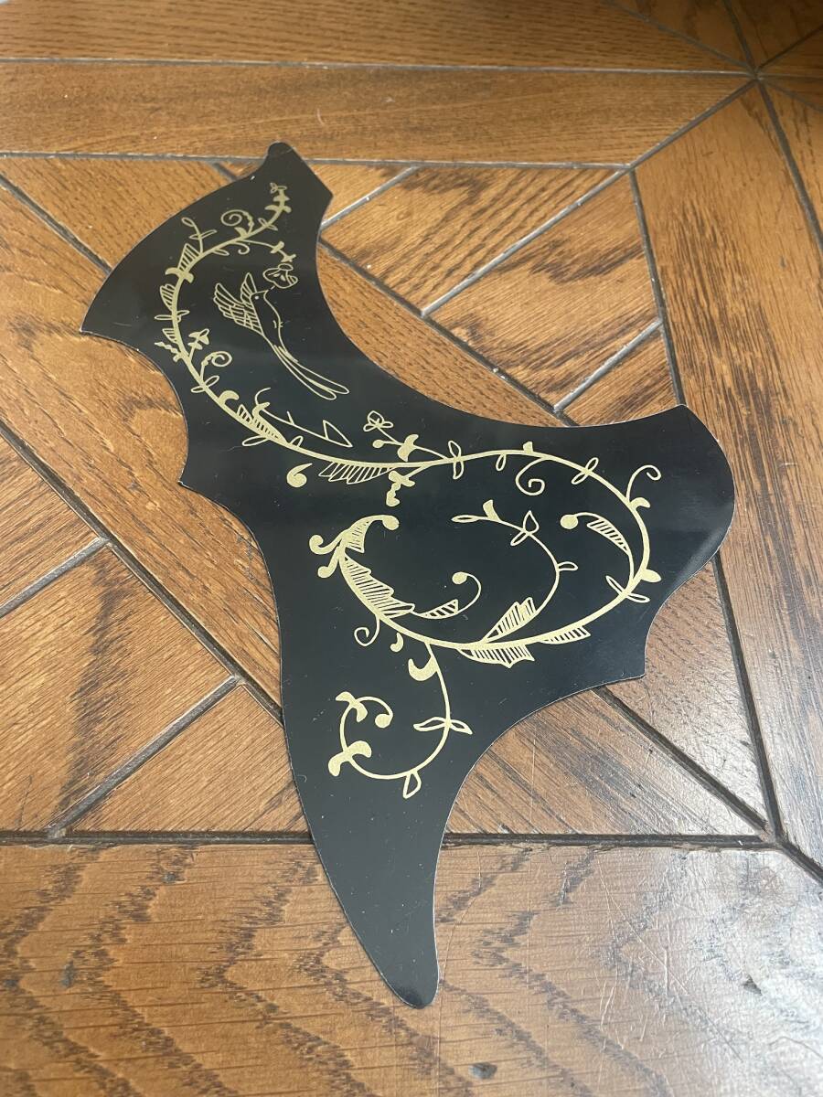 アコースティックギター左用ピックガード ブラック/ゴールドです。サイズは20cm×15cm くらいです。汎用品ですのでほとんどのアコースティックギターに使えるはずです。フォークギター エレアコにもどうぞ。