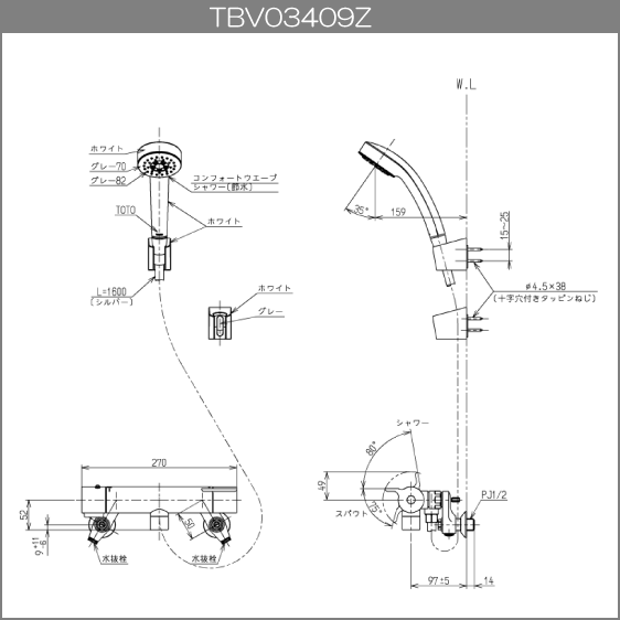 壁付サーモスタット混合栓 サーモシャワー 吐水パイプ 0mm コンフォートウェーブ 寒冷地仕様 TBV03409Z1 TOTO GGシリーズ
