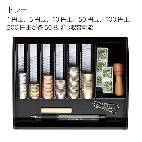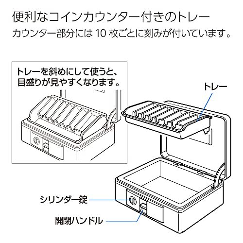 商品説明 | 外寸法:235x195x87mm 内寸法:209x160x33mm コインカウンター付きのトレーを採用 鍵で開閉可能なシリンダータイプ フタ裏に書類押さえ付き