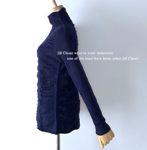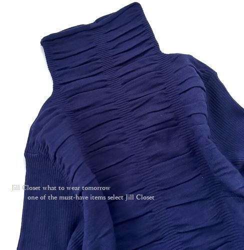新品【送料185円】万能♪伸縮性抜群 シャーリングストレッチニット×リブ*緩やかハイネックdesign*通勤オフィス対応◎プルオーバー4197.NV