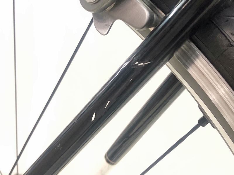 また、トップチューブにステッカー痕と目立つキズ、右シートステーにキズがあります。
