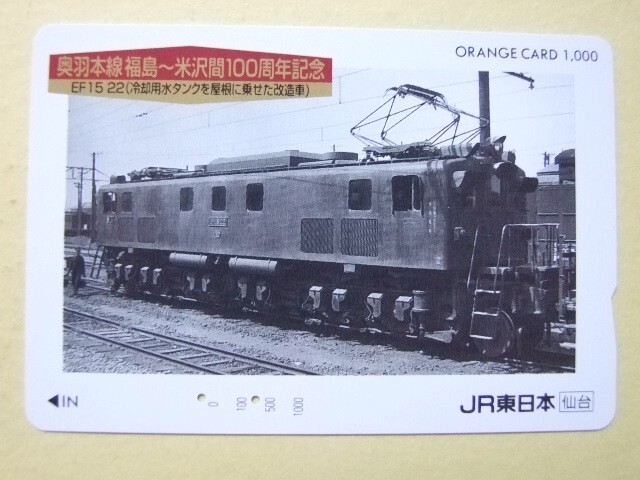 ◇オレンジカード 使用済 多穴券◇JR東日本 仙台『奥羽本線 福島ー米沢間100周年記念 EF15 22(冷却用水タンクを~)』USED品 009810