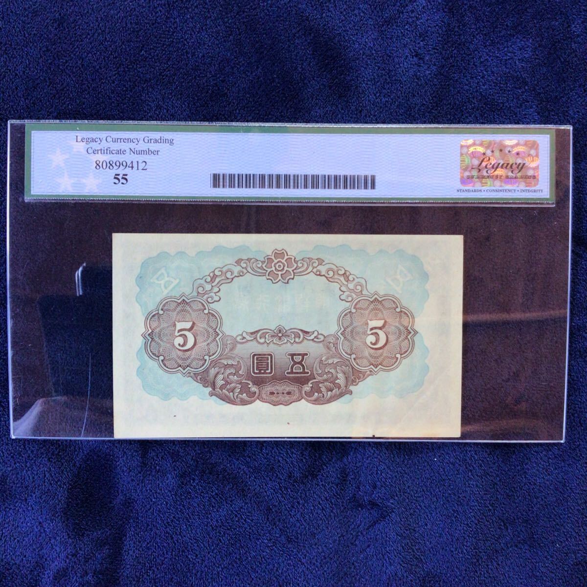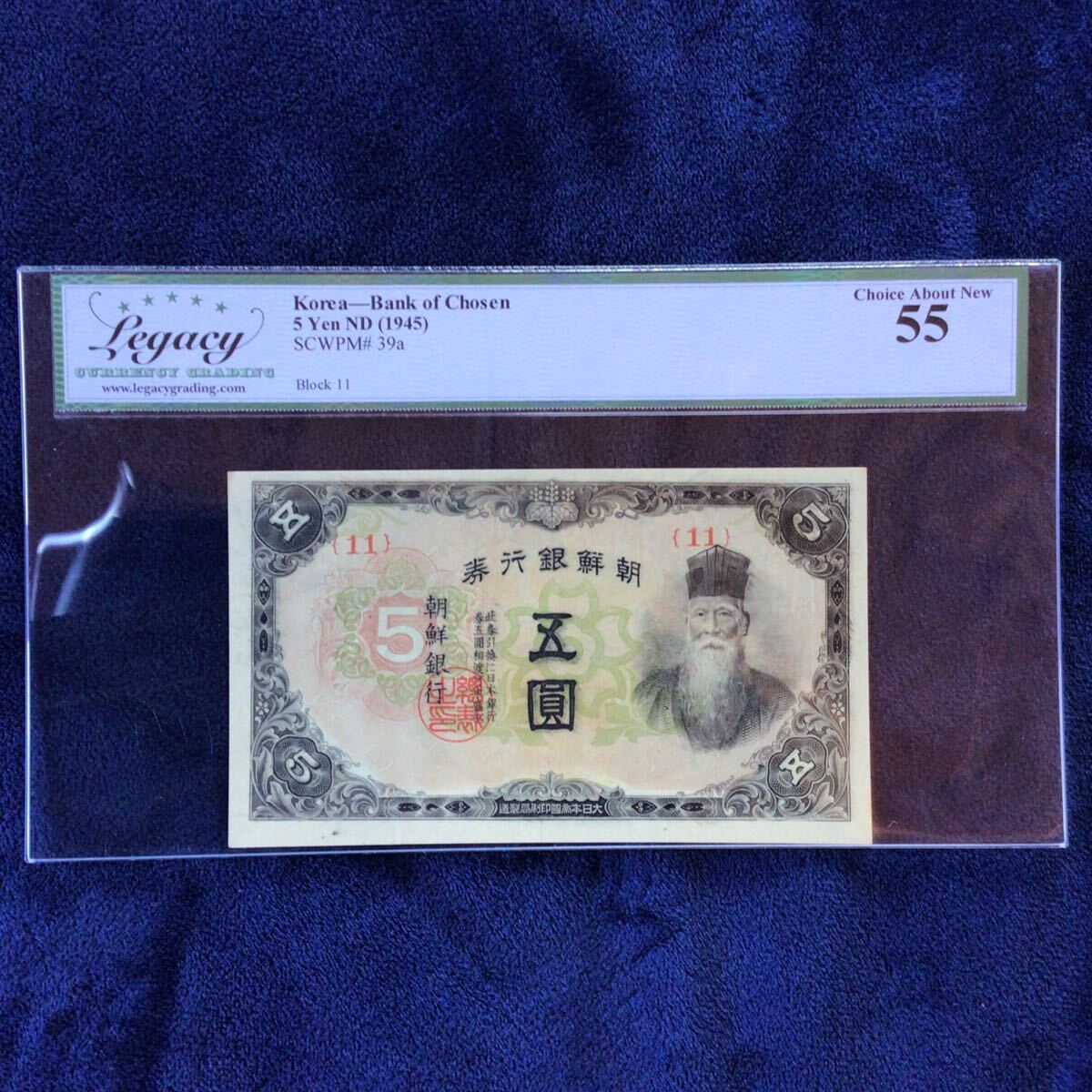 韓国《朝鮮銀行》五圓【1945】『Legacy Currencyグレーディング鑑定 未使用 55』