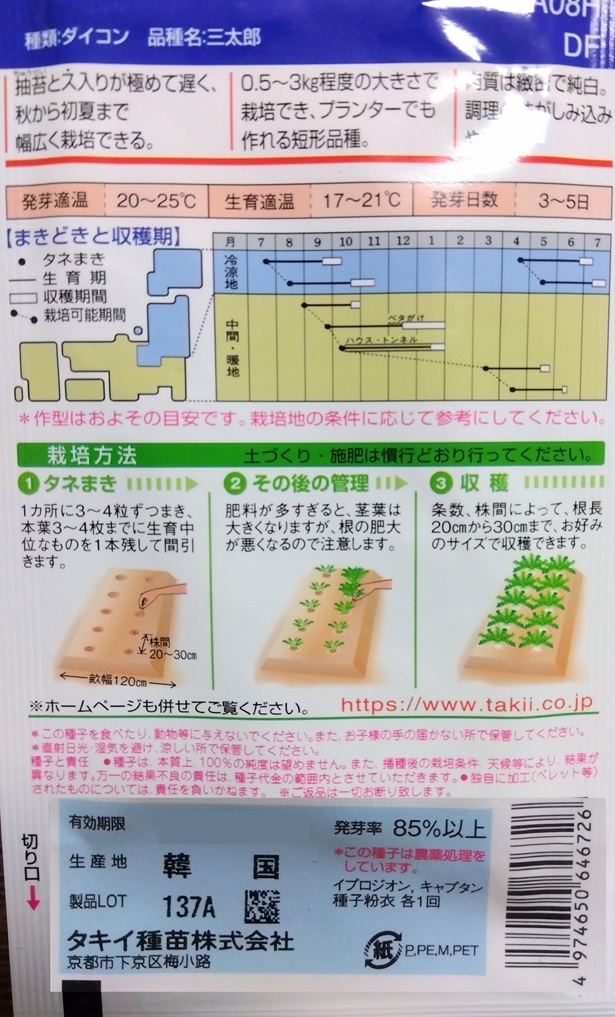 数年前まで、大根は根が深いし難しそうと敬遠していましたが、三太郎はそんな人におすすめしたい品種です。
