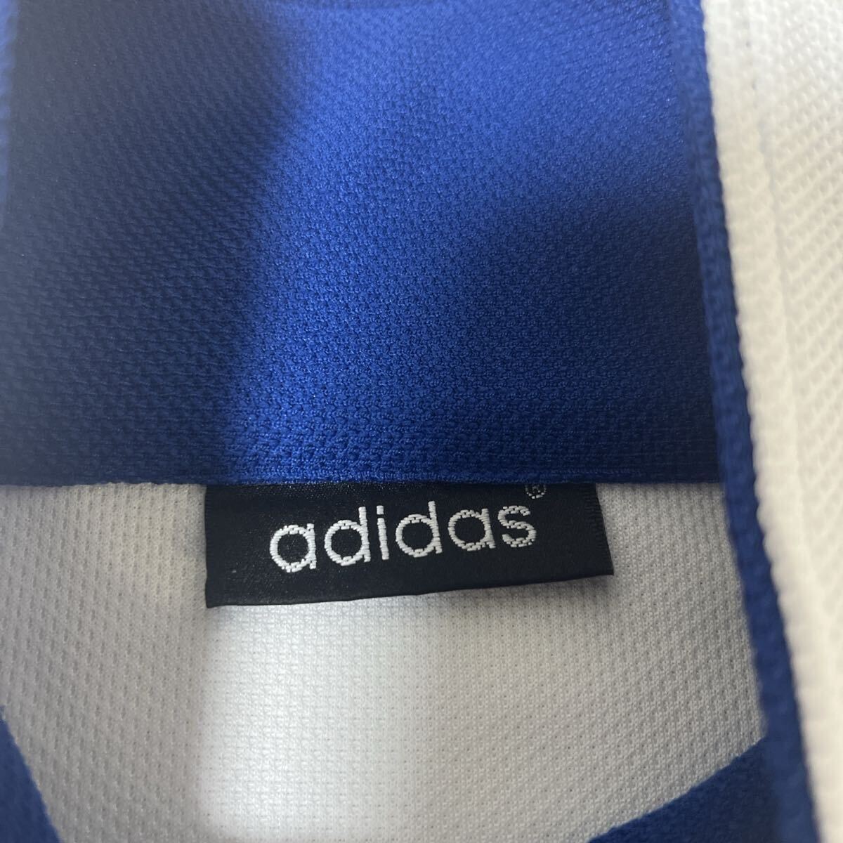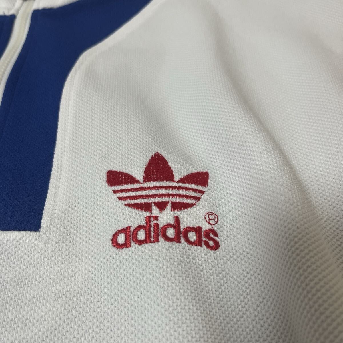 バックに大きなトレフォイルロゴ、総刺繍、トレフォイル型ジップ、トリコロールカラーが特徴的なジャケットです。