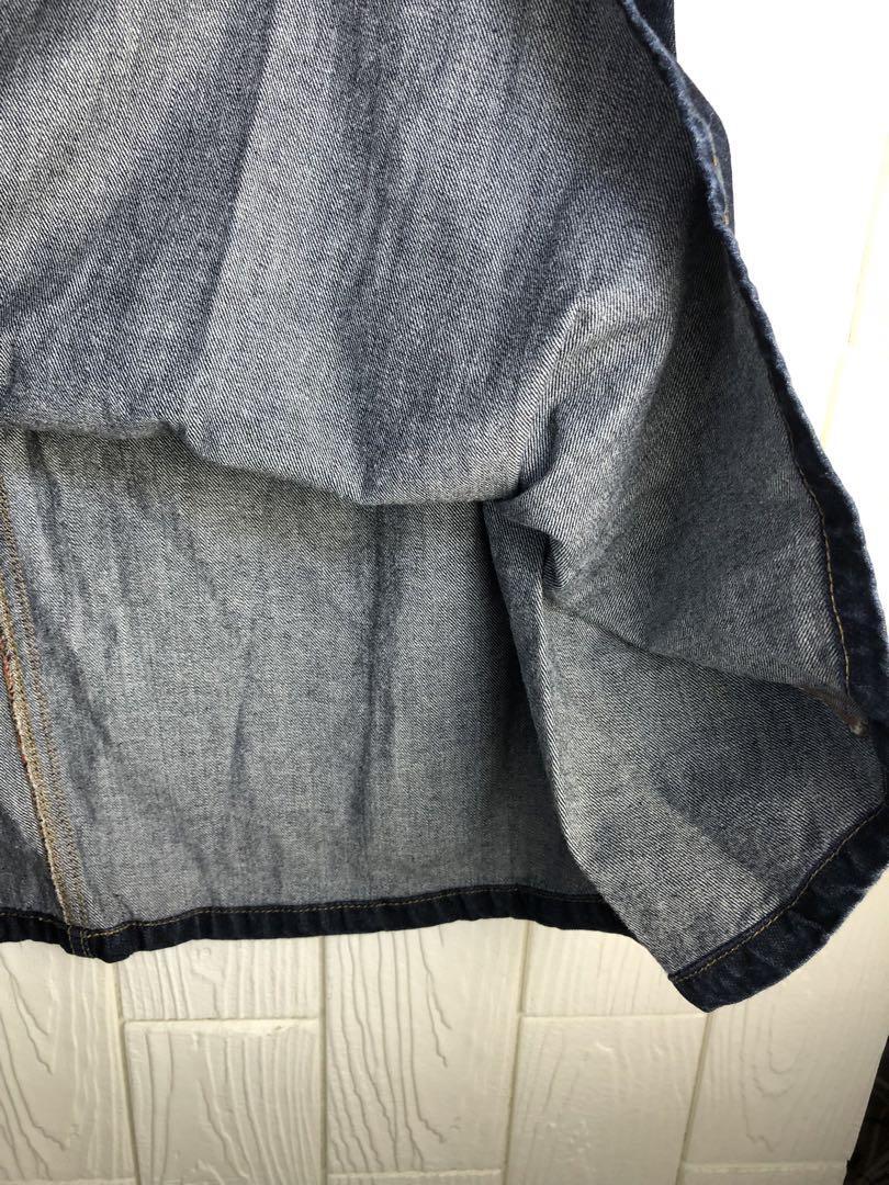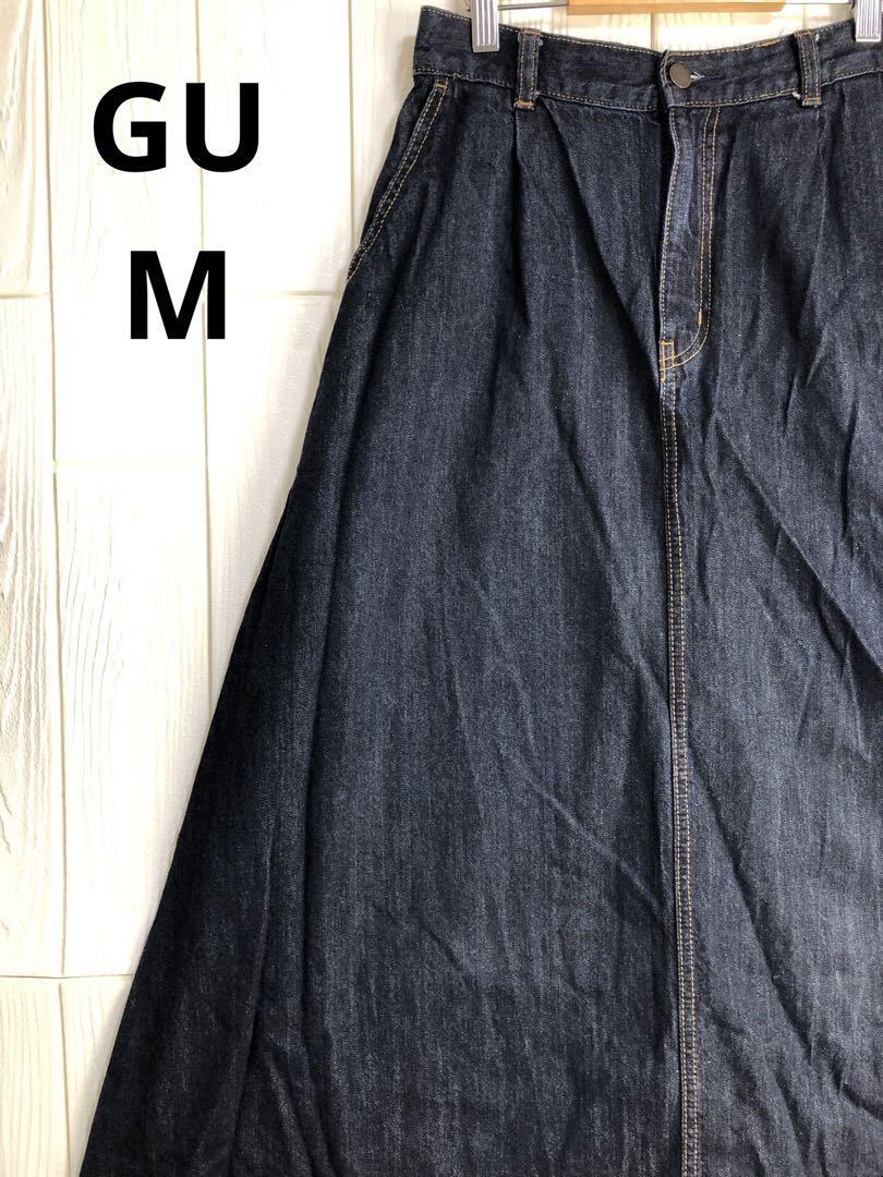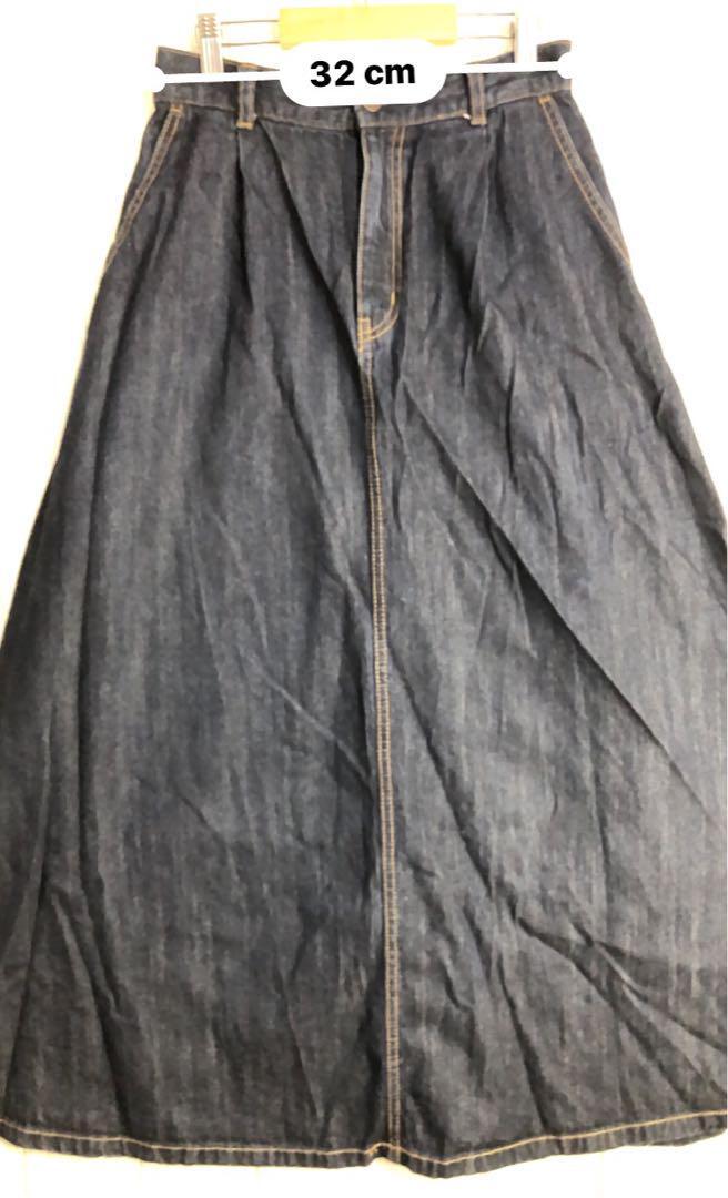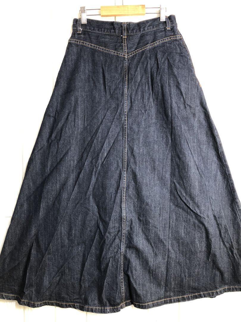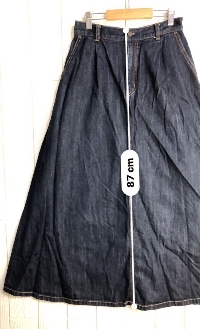 ダークデニムのフレアスカート、ウエスト64cm、着丈87cm。