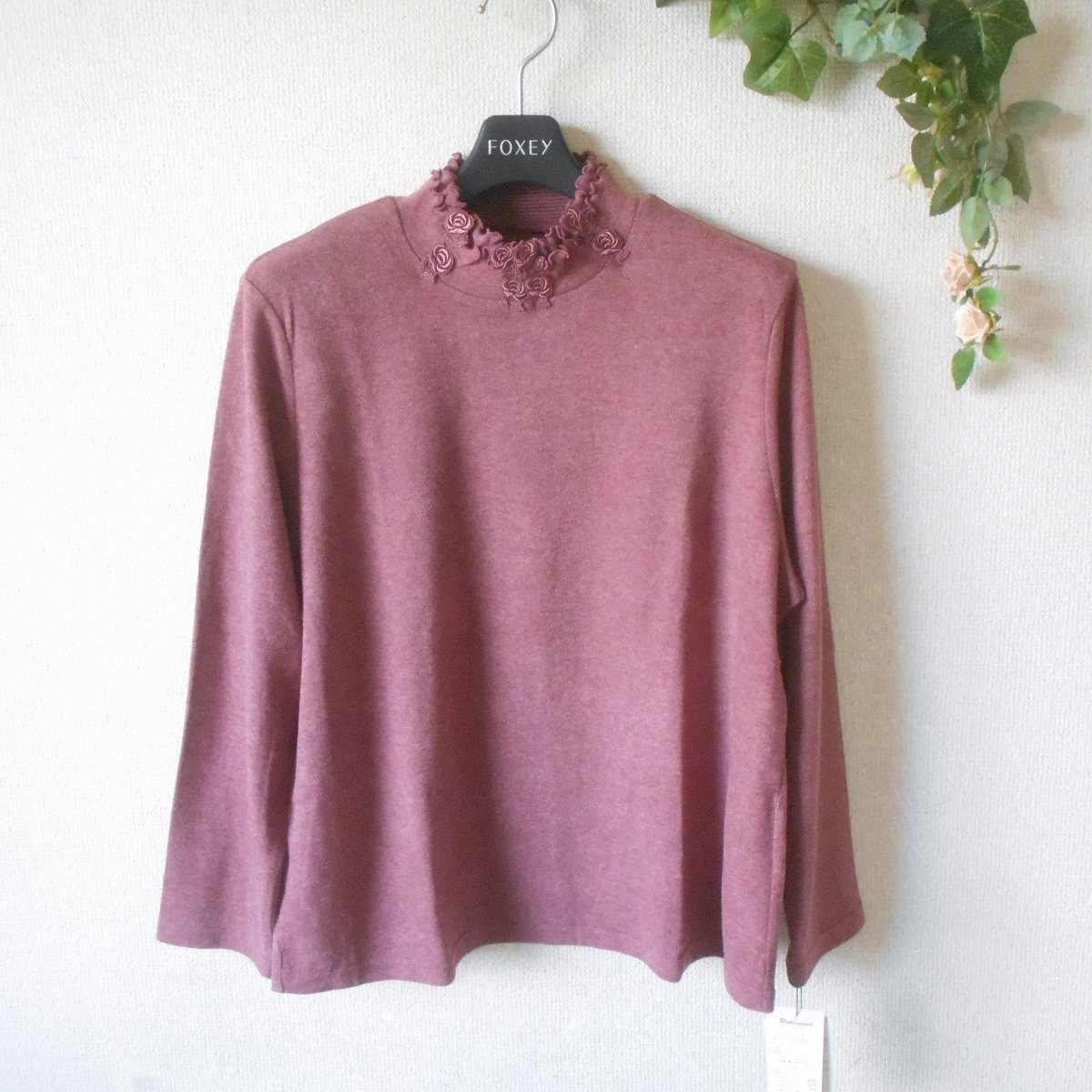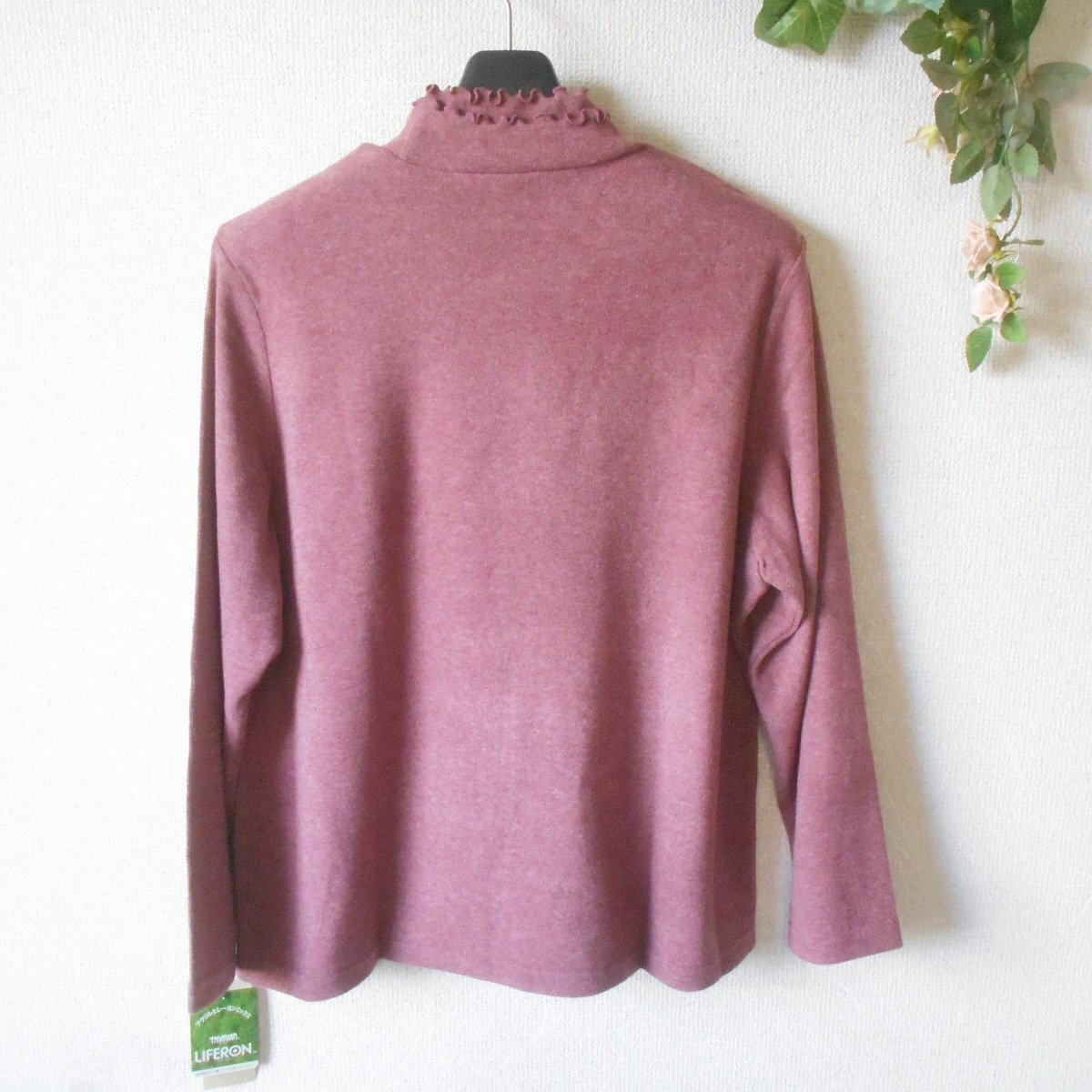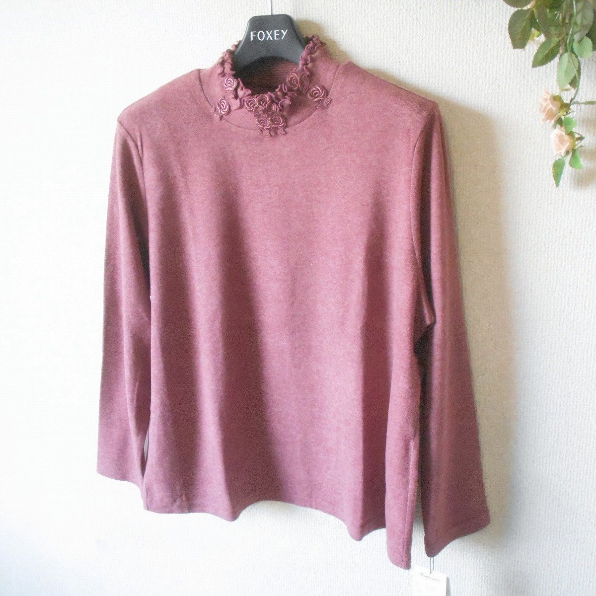 【ポイント】アンプラグドのレディース用セーターになります。お色はくすみピンク系で秋冬を中心に着ていただけるお品です。ハイネック部分にはお花のレースが付いた、とっても素敵なデザインです。