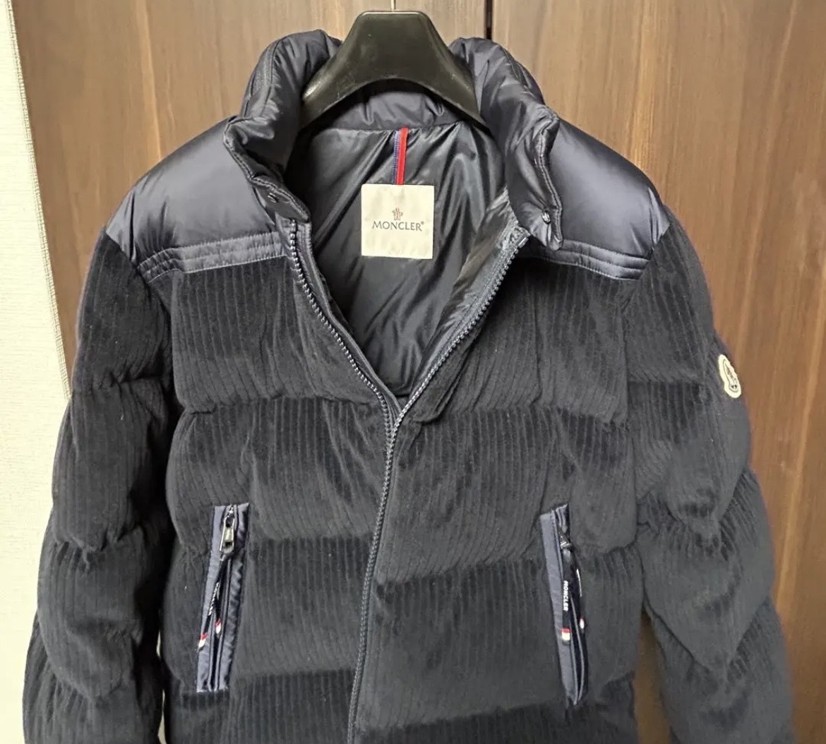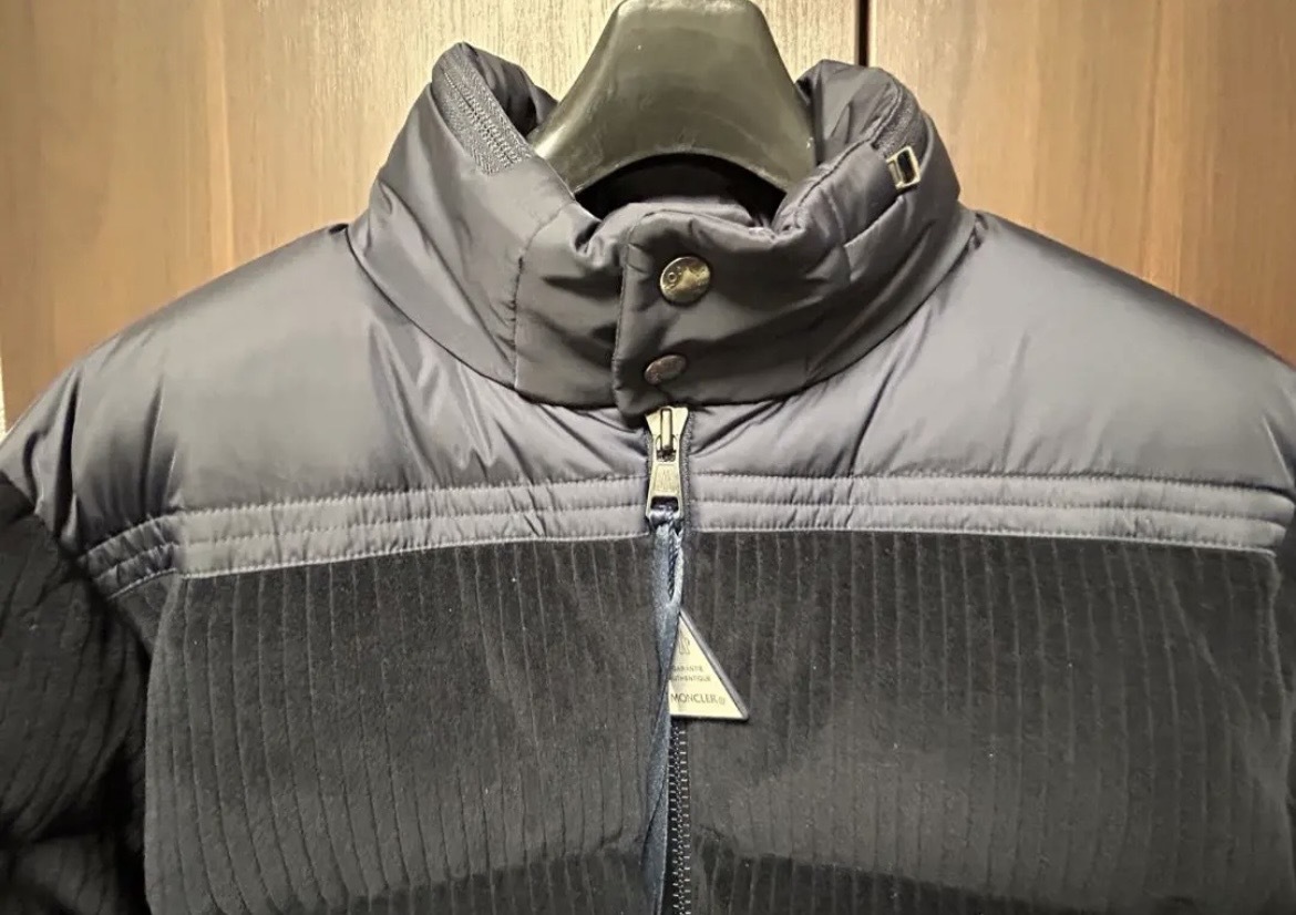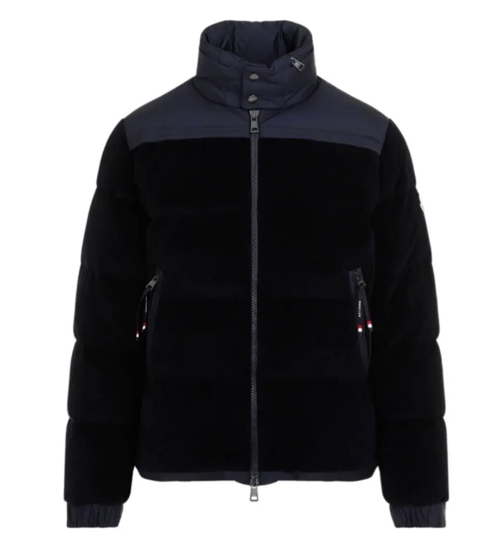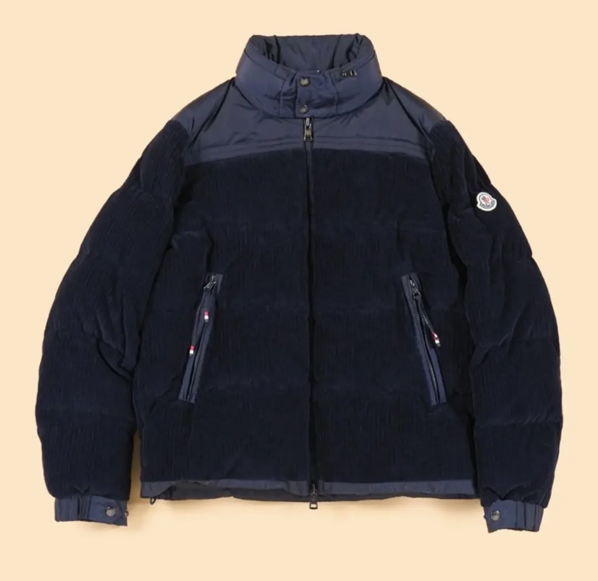 コーデュロイ/ナイロンのコンビ素材のネイビーダウンジャケット、ジッパーポケット付きで機能性も兼ね備えています。フードが襟元に収納されております。